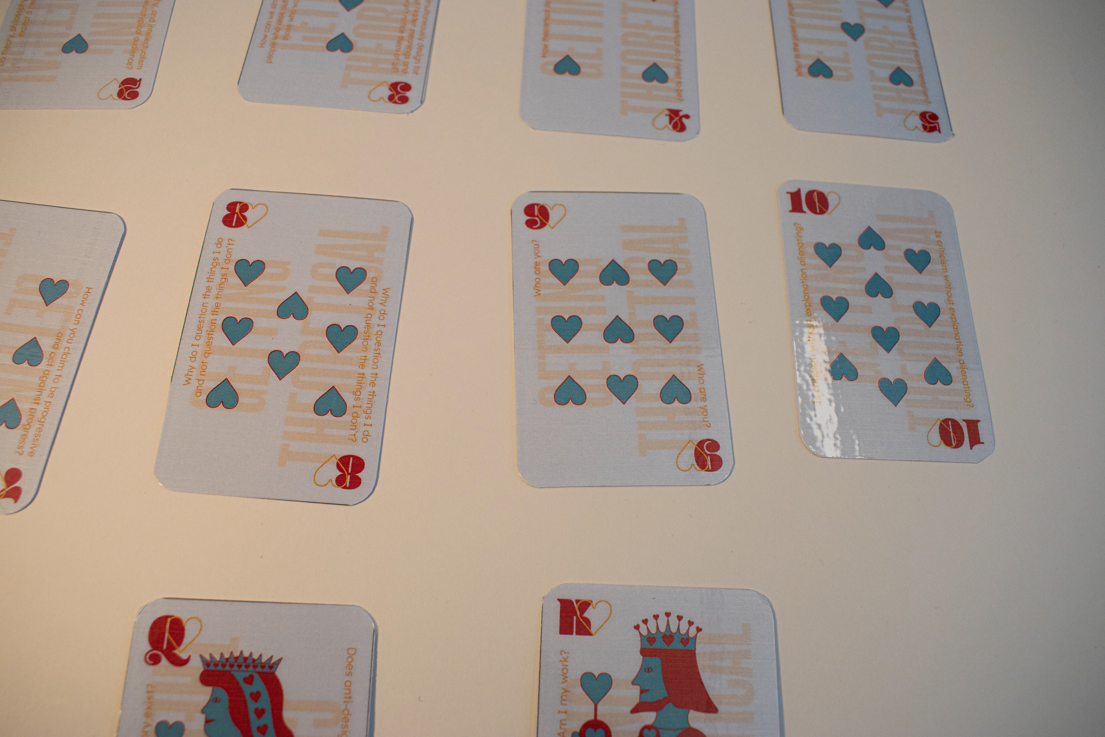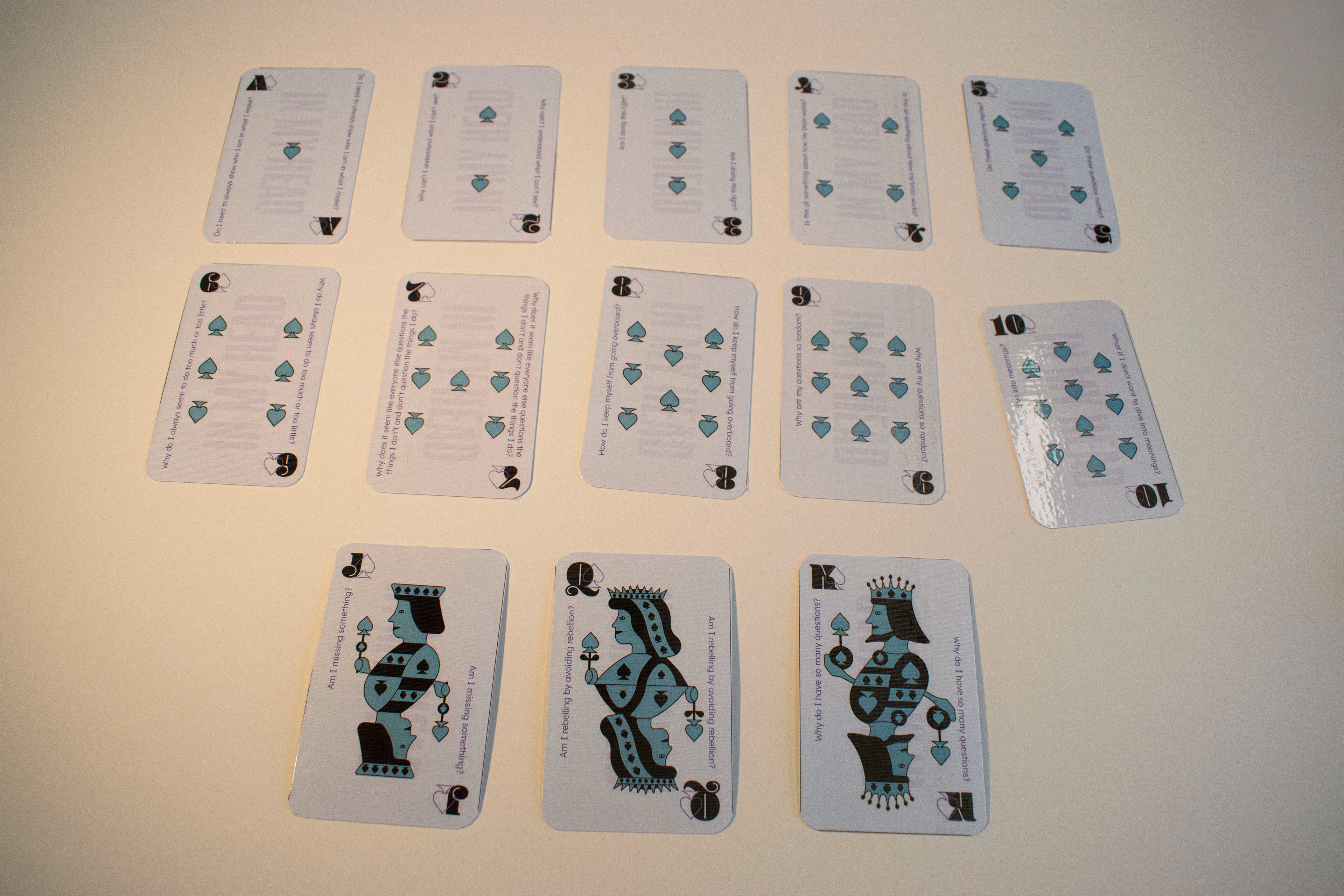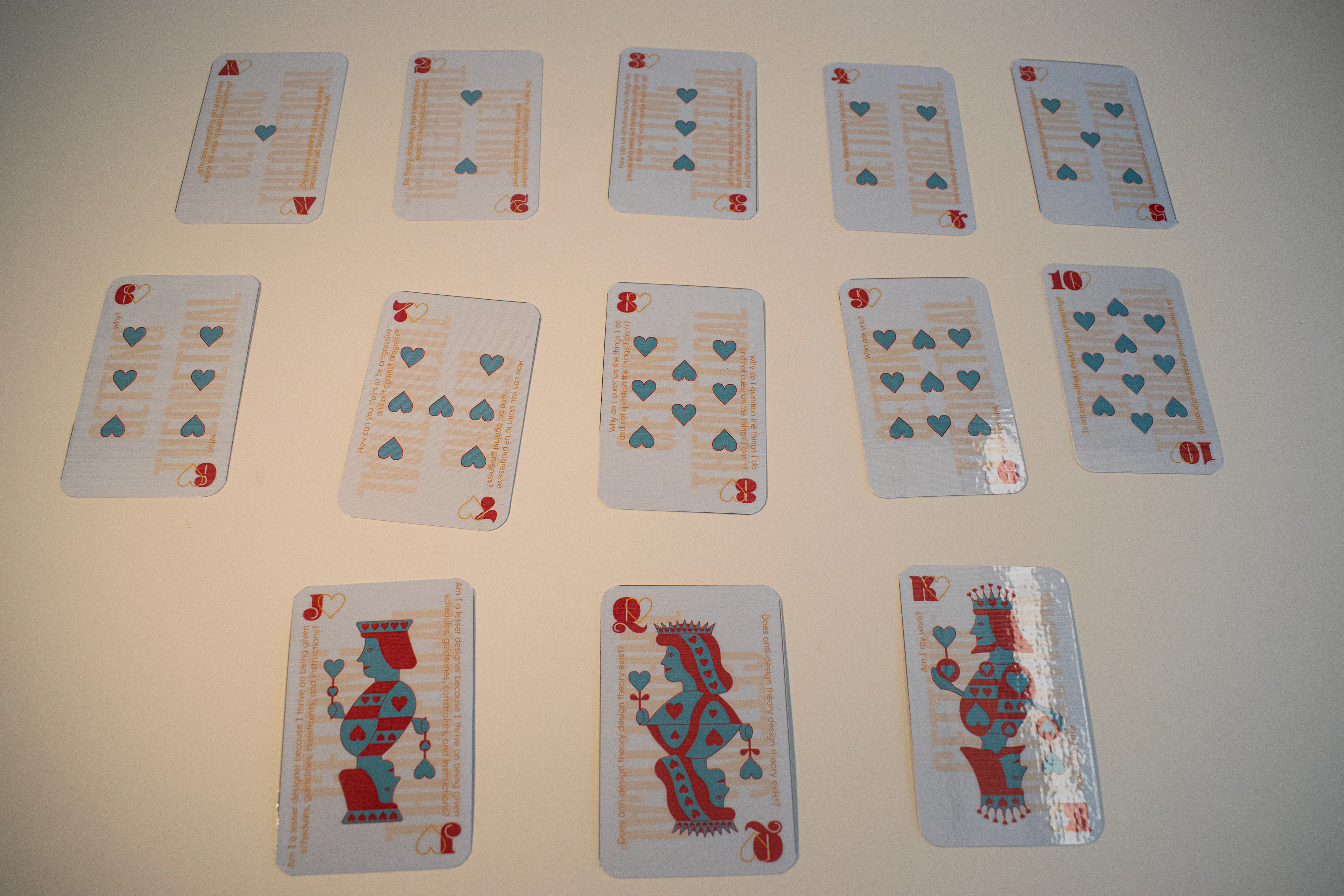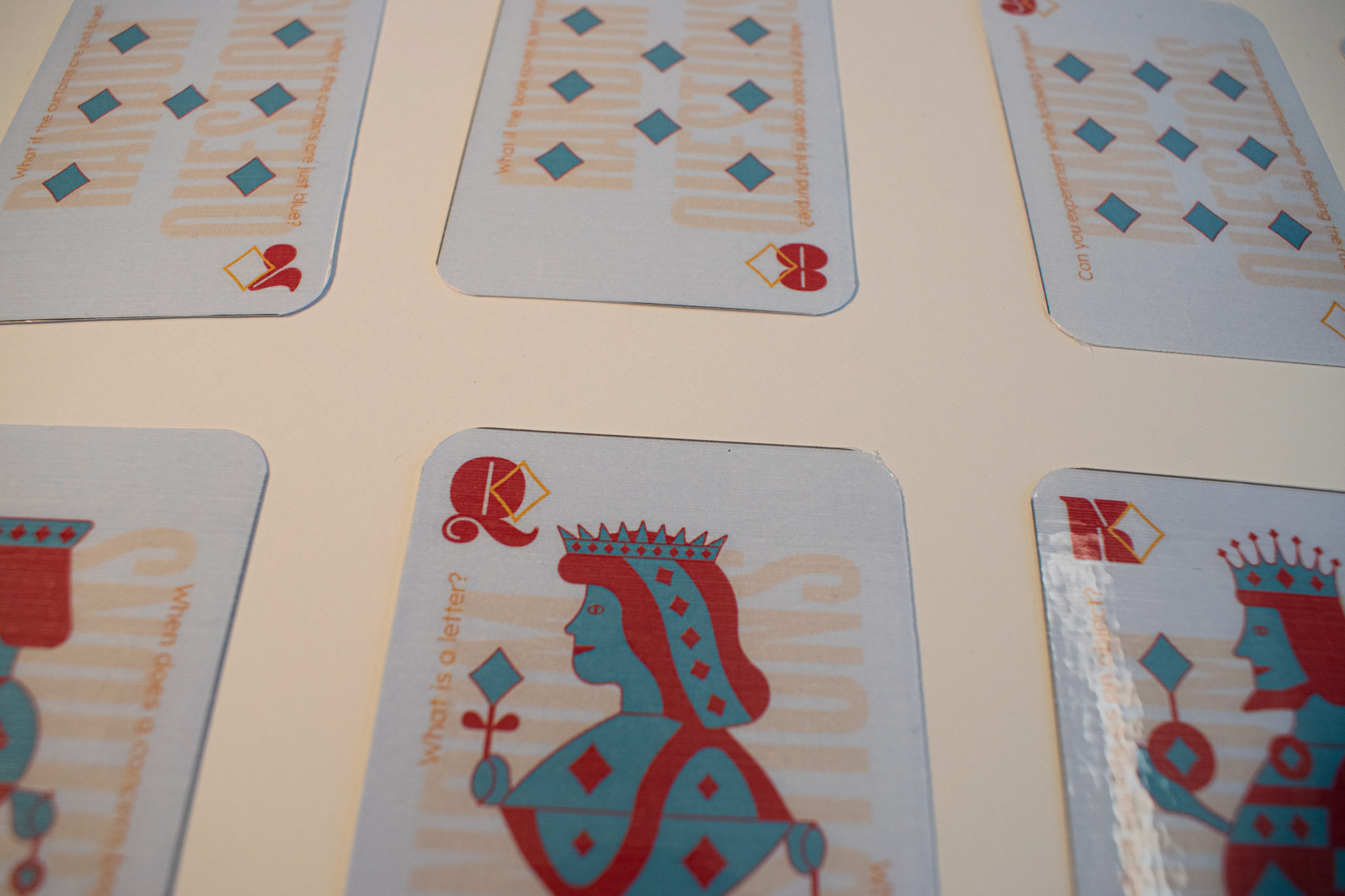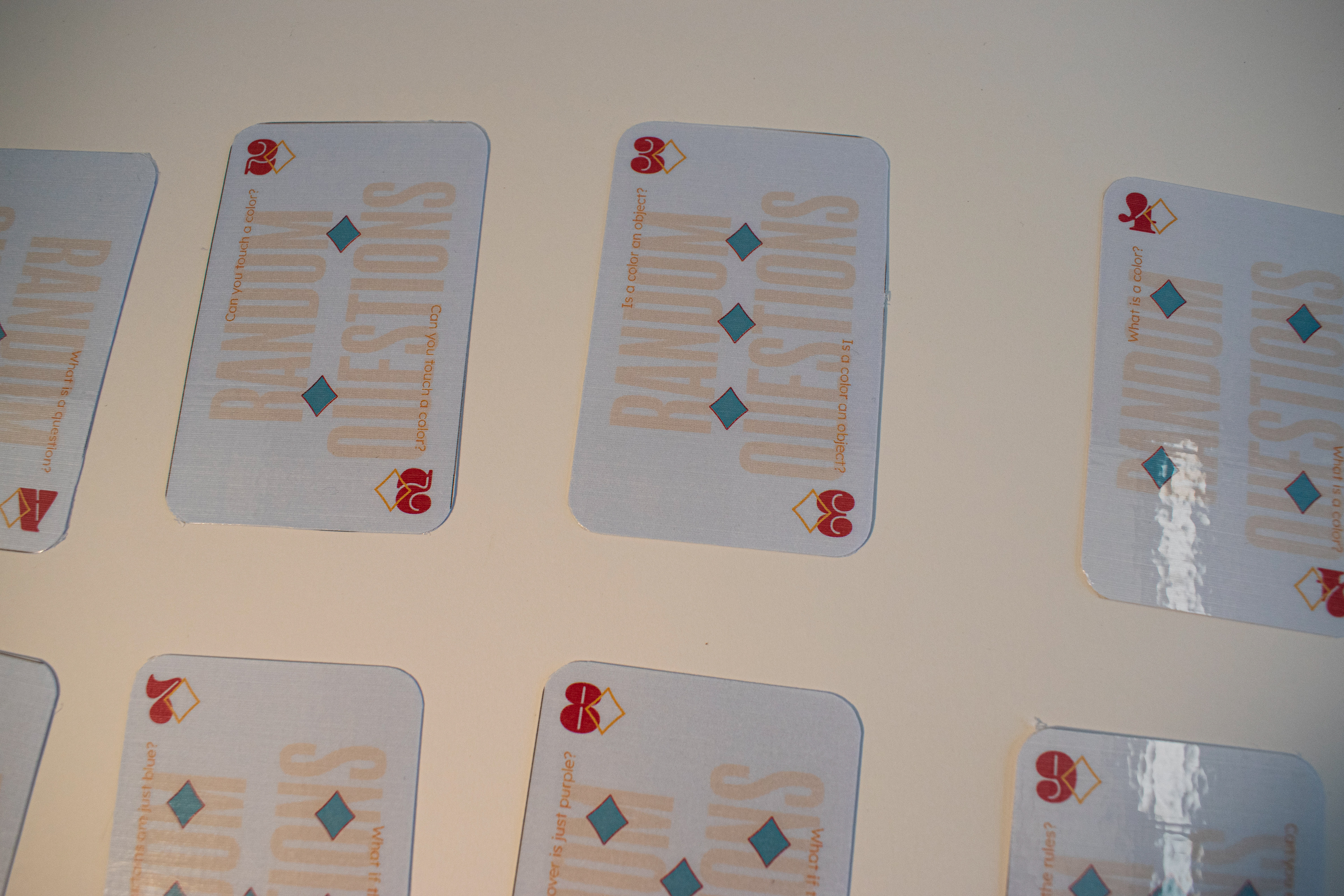 The 50 Questions assignment was seemingly simple. We were prompted to ask at least 50 questions and then present them in some sort of designed object. The idea for playing cards came simply from thinking of things that came in sets of about 50. I sorted my questions into 4 categories using the suits of the playing cards and assigned one question to each of the 52 cards. I tested out different types of paper by playing solitaire because if I was going to make playing cards, I wanted to actually be able to play card games with them. The cards are printed on my favorite paper (Southworth Linen for those who are interested) and then laminated the paper to get the look, feel, and function of playing cards. I really enjoyed the repetitive nature of working in the medium of playing cards. I love that every card is just slightly different from all of the others. My classmates also found joy in this project. As I was presenting, they started building houses of cards and sorting the cards in numerical order. This became a truly interactive project.