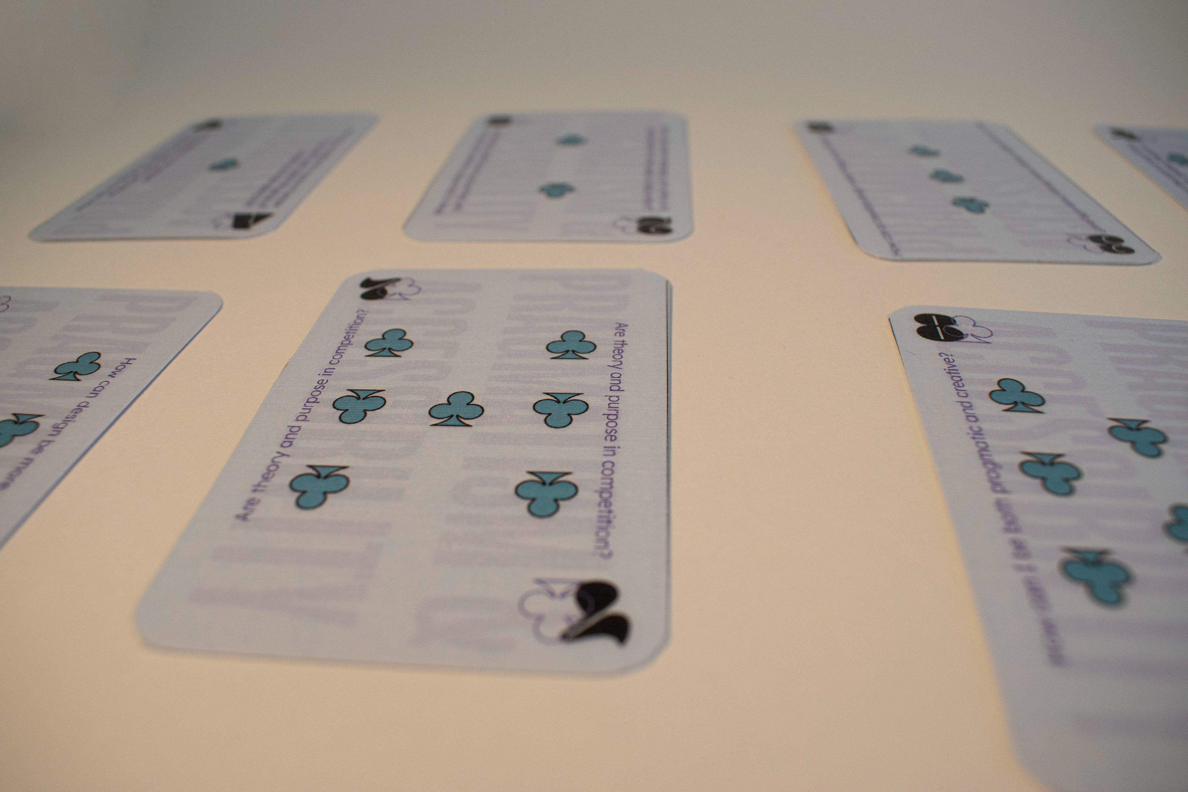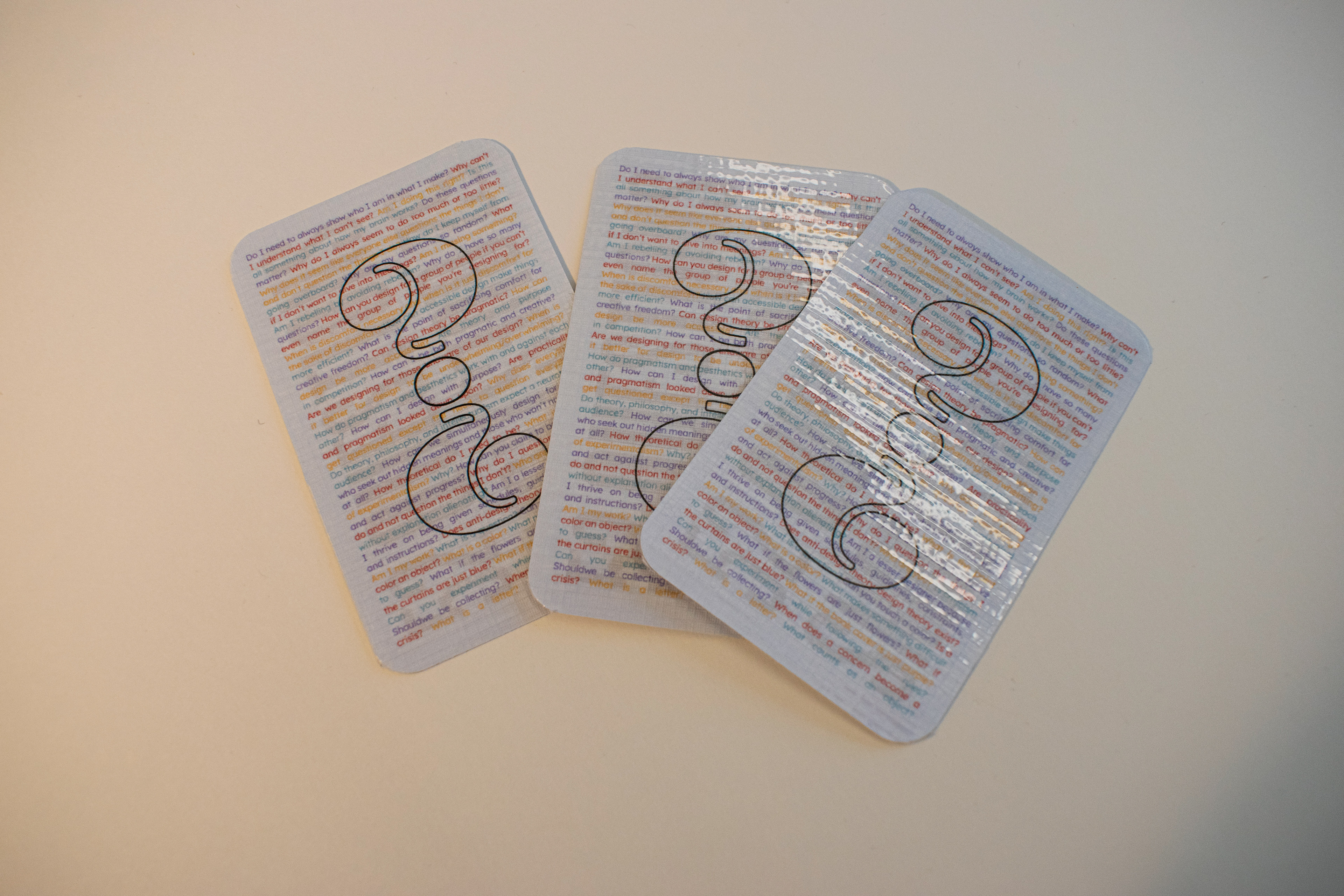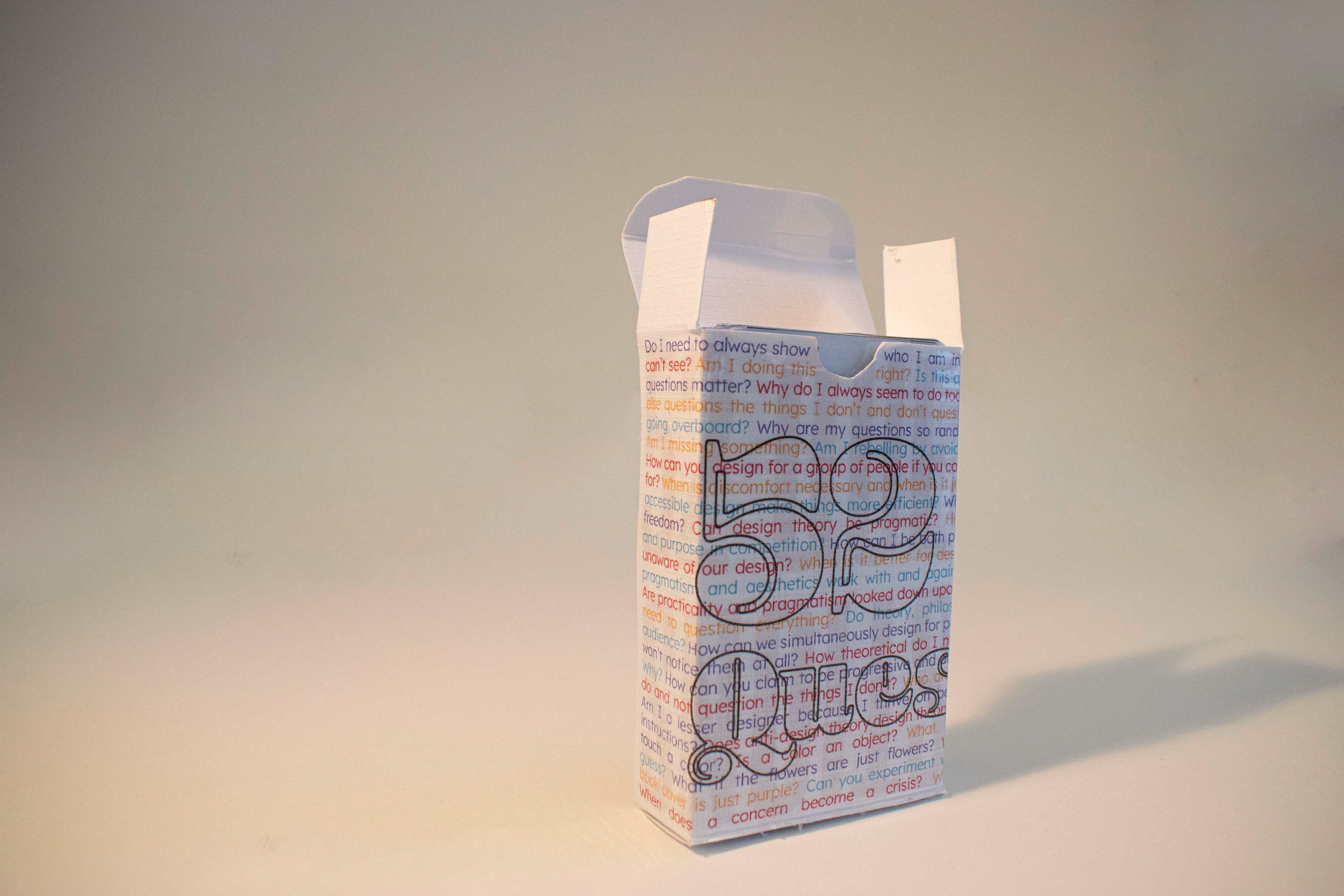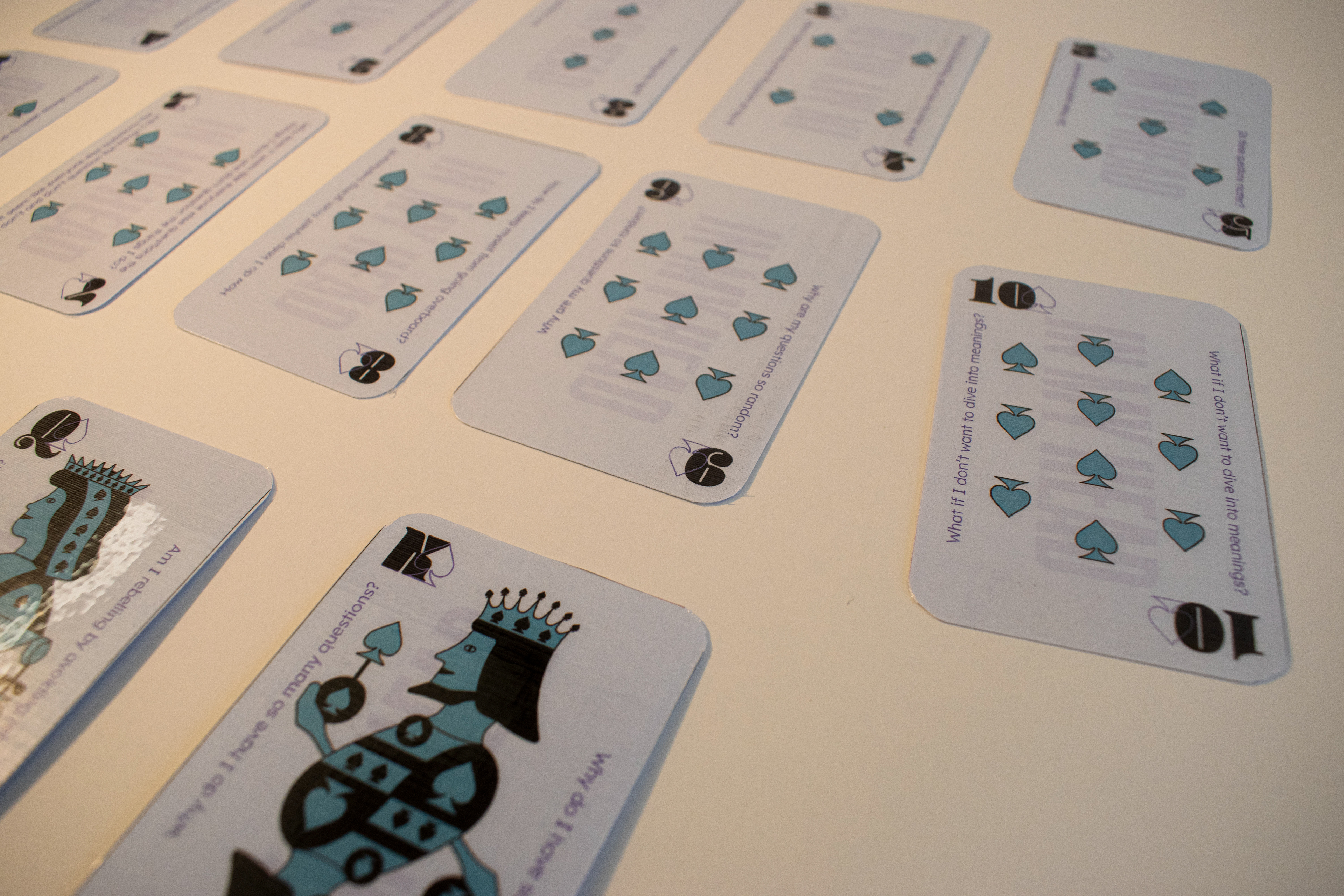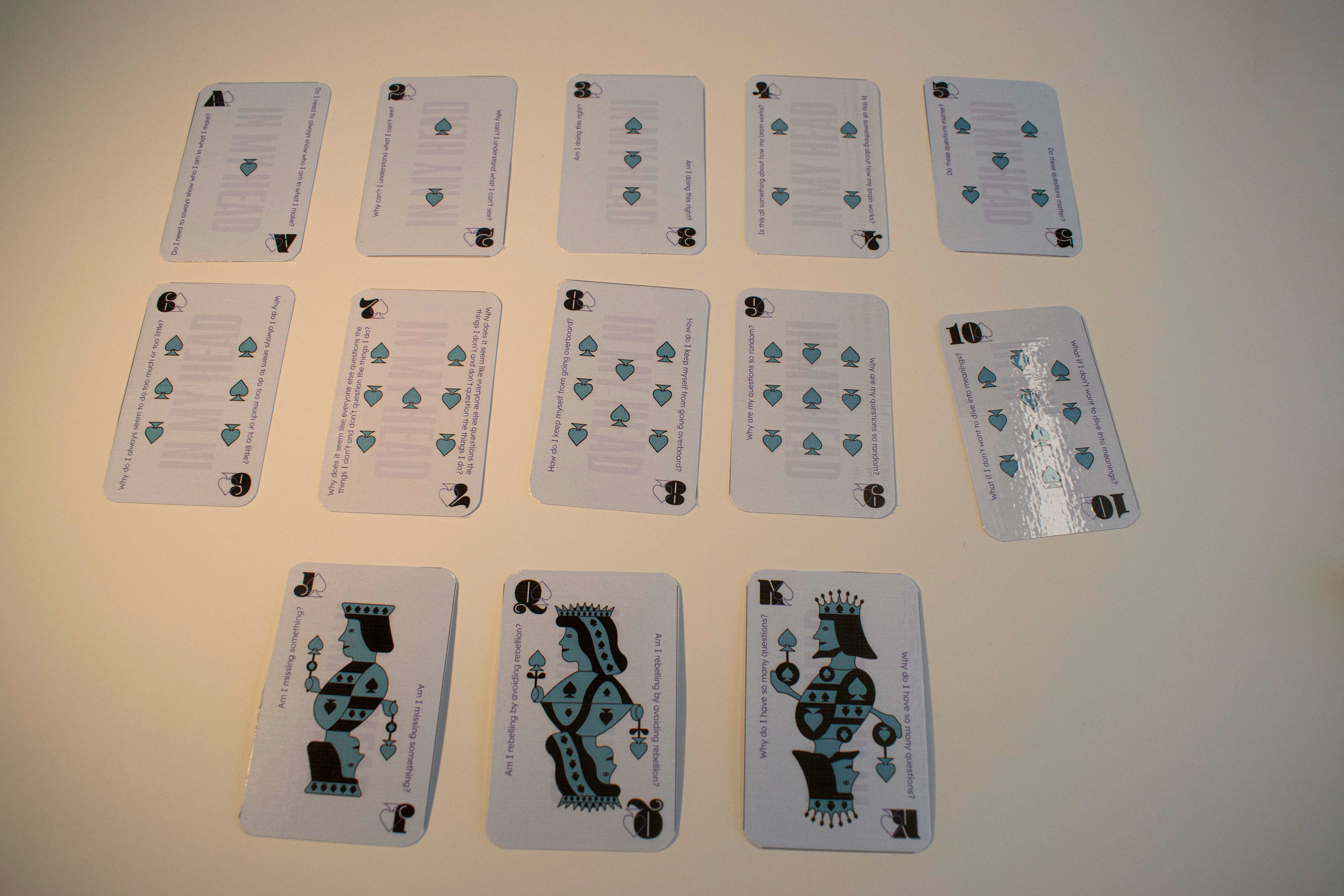 The 50 Questions assignment was seemingly simple. We were prompted to ask at least 50 questions and then present them in some sort of designed object. The idea for playing cards came simply from thinking of things that came in sets of about 50. I sorted my questions into 4 categories using the suits of the playing cards and assigned one question to each of the 52 cards. I tested out different types of paper by playing solitaire because if I was going to make playing cards, I wanted to actually be able to play card games with them. The cards are printed on my favorite paper (Southworth Linen for those who are interested) and then laminated the paper to get the look, feel, and function of playing cards. I really enjoyed the repetitive nature of working in the medium of playing cards. I love that every card is just slightly different from all of the others. My classmates also found joy in this project. As I was presenting, they started building houses of cards and sorting the cards in numerical order. This became a truly interactive project.