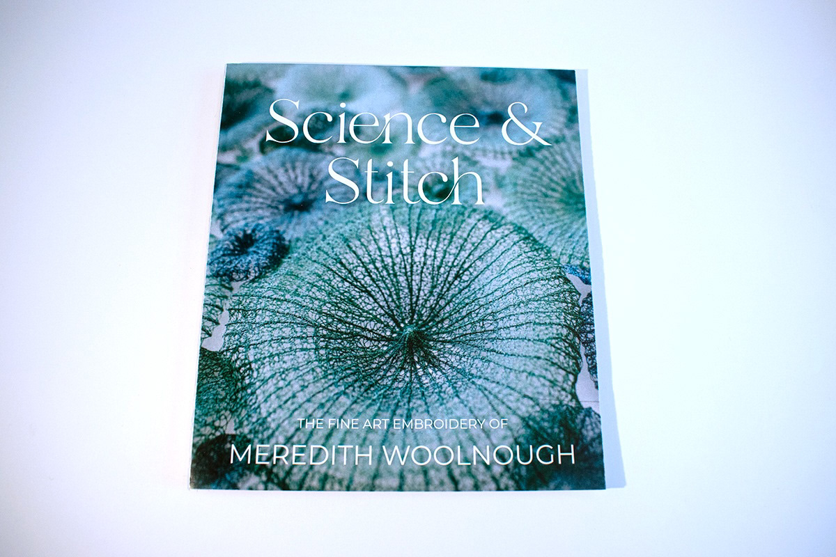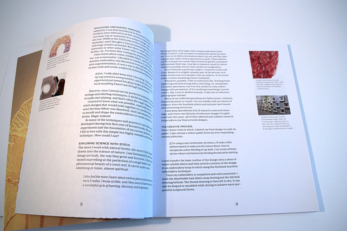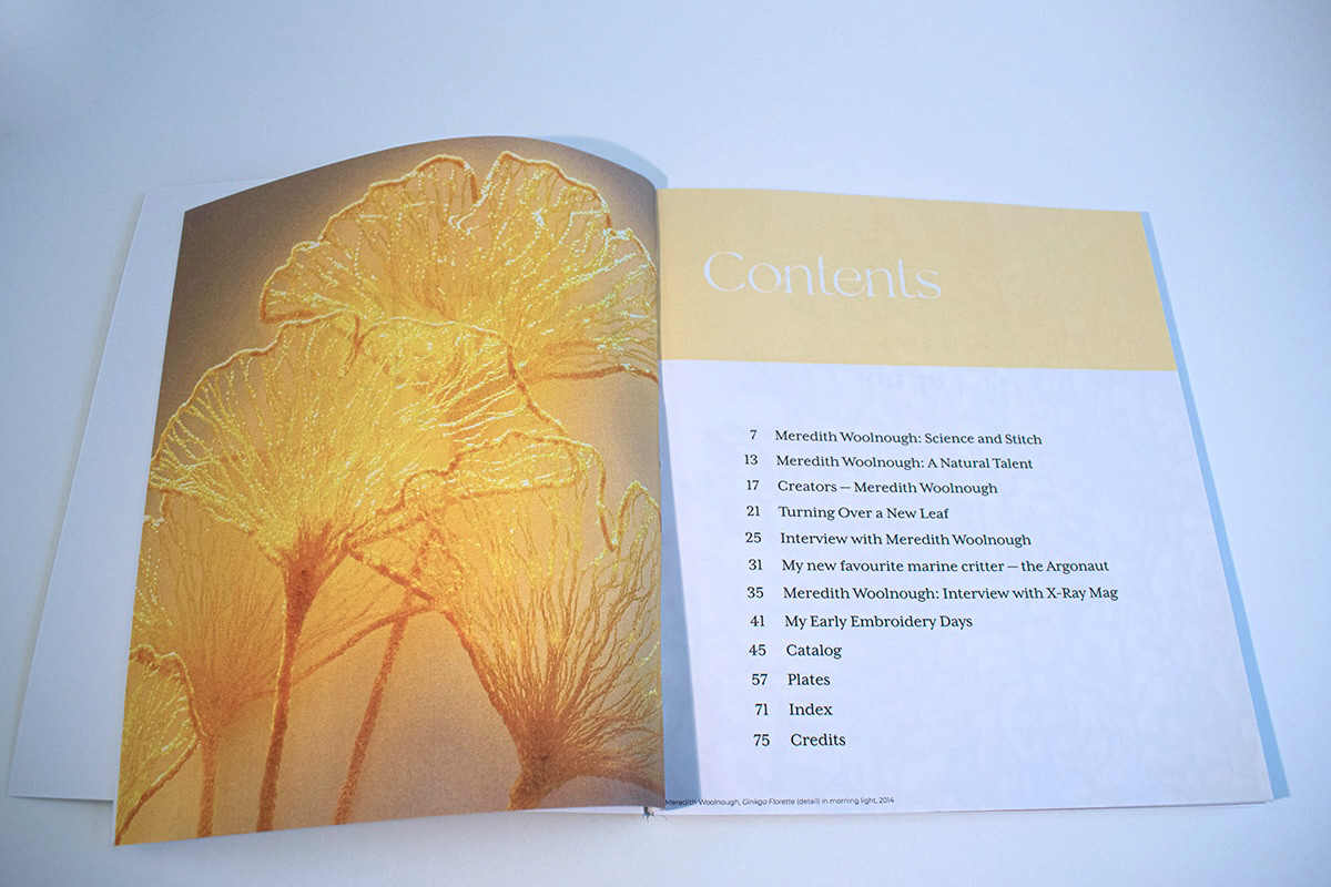 I decided to focus on Australian fiber artist, Meredith Woolnough in designing this artist monograph. The articles are sourced from TextileArtist.org, The School of Stitched Textiles, Polyfield Magazine, Embroidery Magazine, X-Ray Mag, Arte Morbida, and Woolnough's own website. I was inspired by the bright colors and fascinating textures in Woolnough's work in my choices of colors and typefaces. This 78-page publication is set in Branch, Mrs Eaves XL Serif OT, and Montserrat.