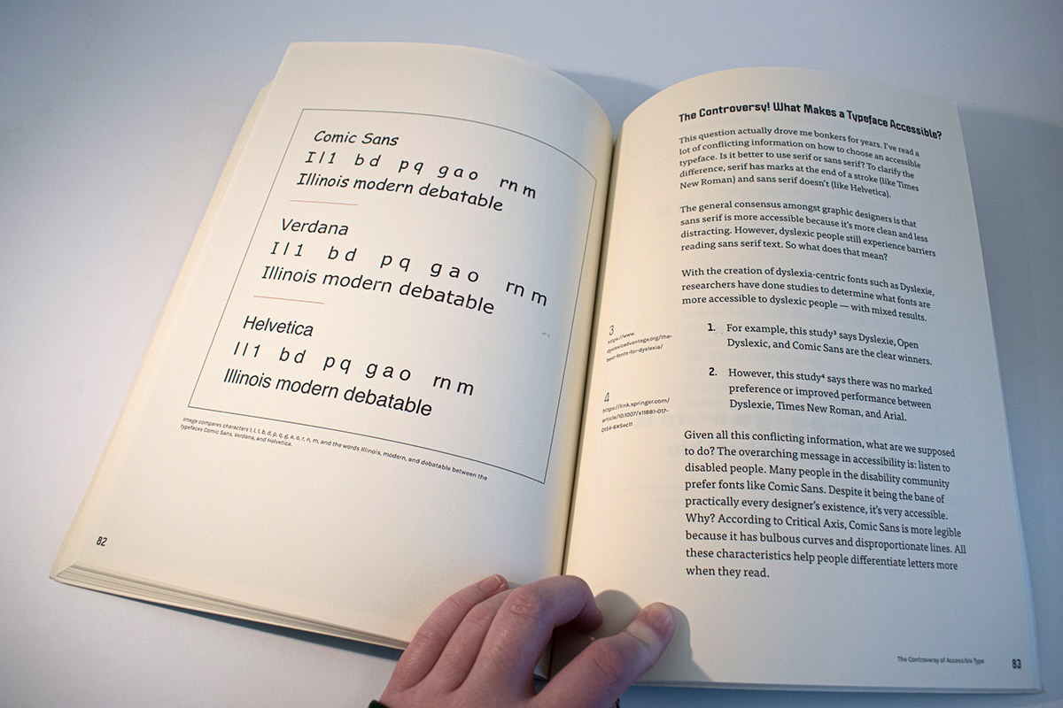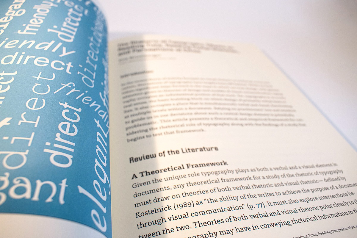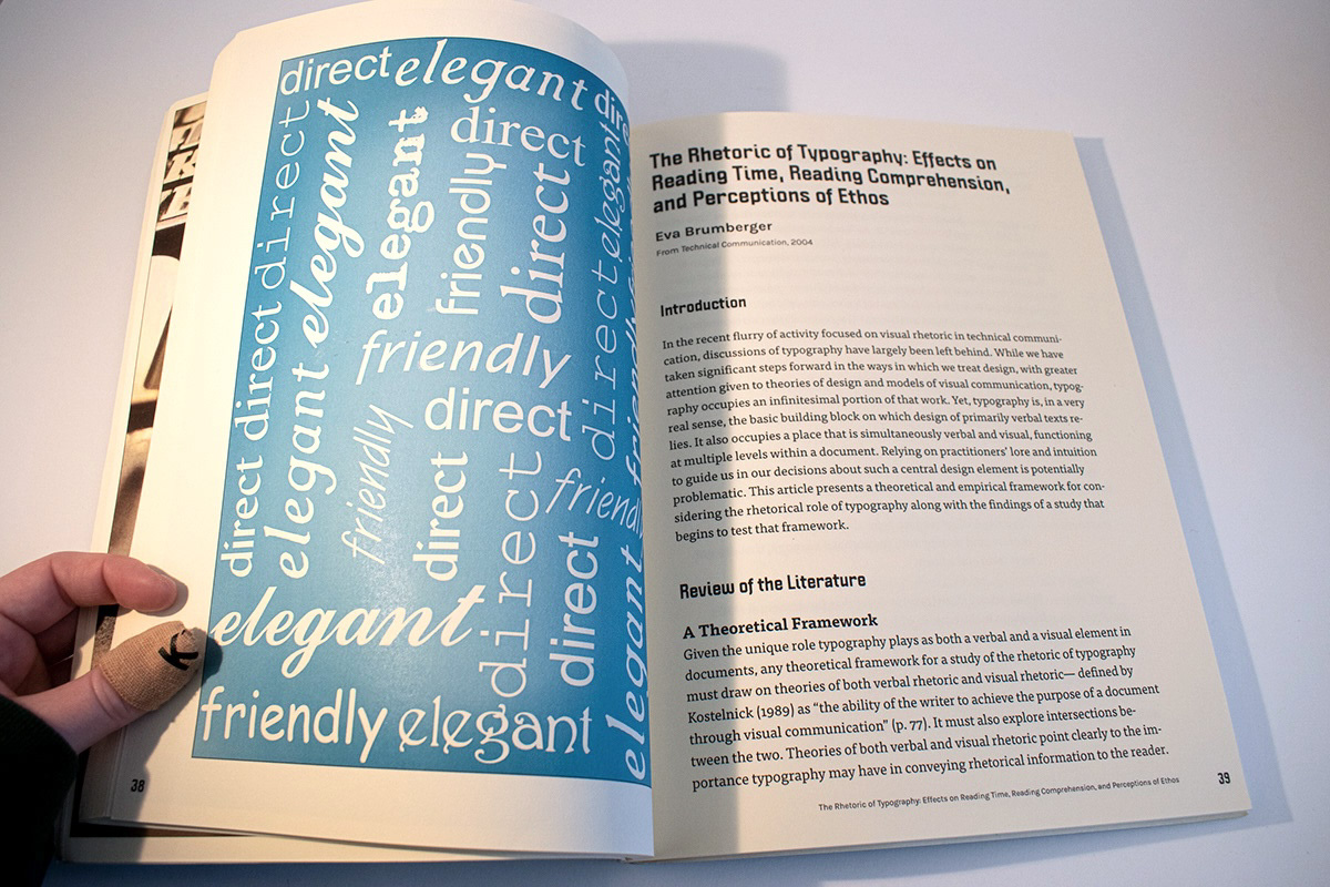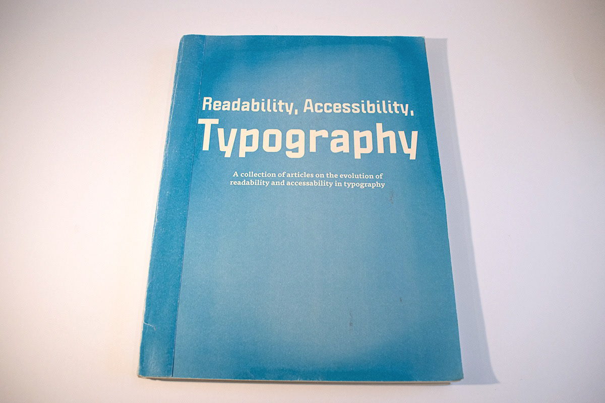 This research publication is a collection of 12 articles related to the topic of accessible typography. I seriously considered accessibility when choosing typefaces and made the careful selection of Tisa Pro and Politica for this 143 page book.