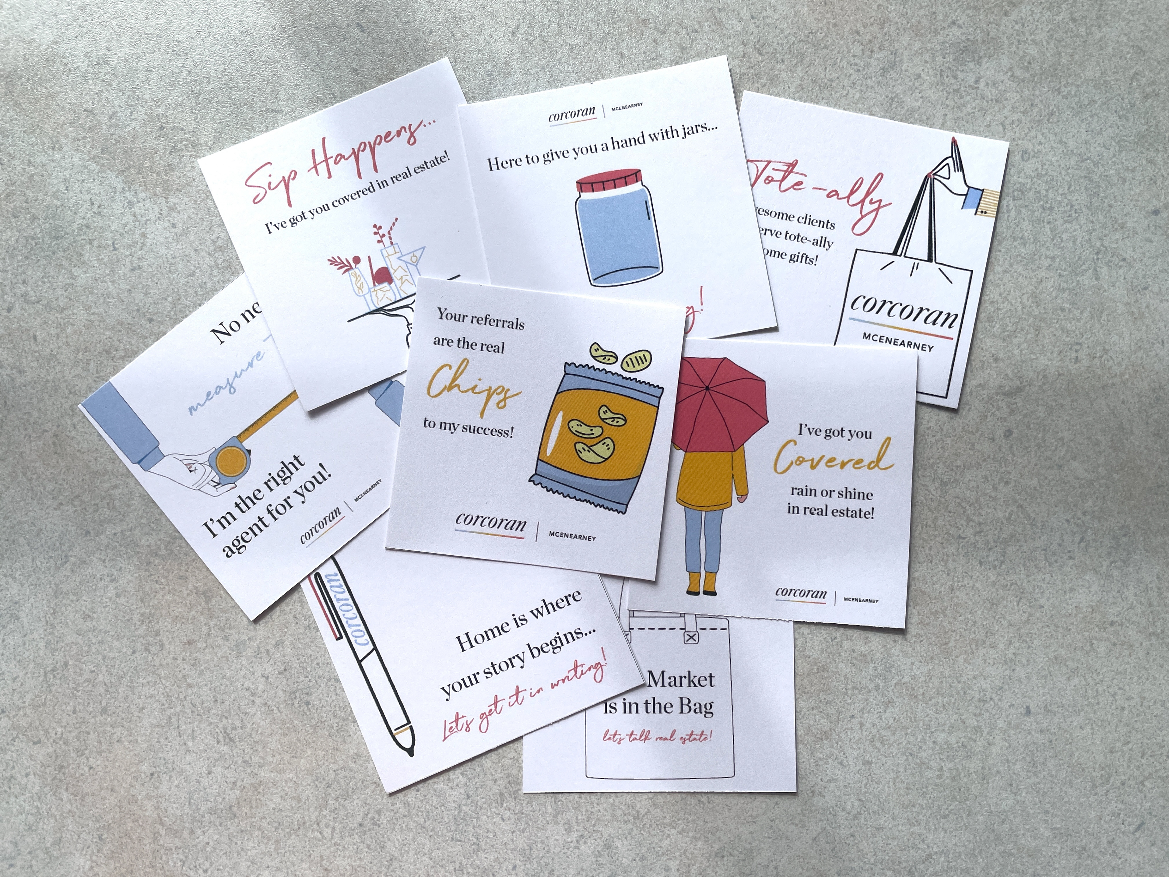 Many of our agents would connect with their client base with pop-by gifts. The following images are examples of tags I made to accompany these gifts.