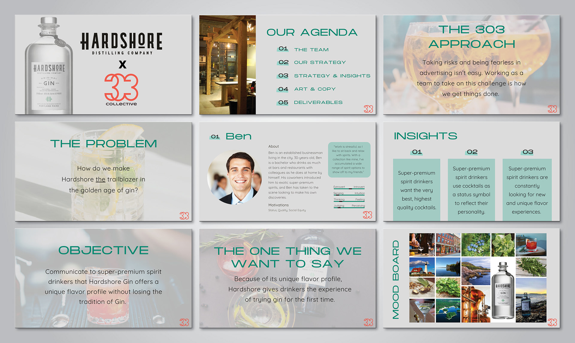 For my undergraduate capstone course, we were grouped into teams and assigned real-world clients to create advertising and strategy for them. As one of the art directors on a team assigned to the Hardshore Distilling Company, I was tasked with designing our advertisements and presentation materials.