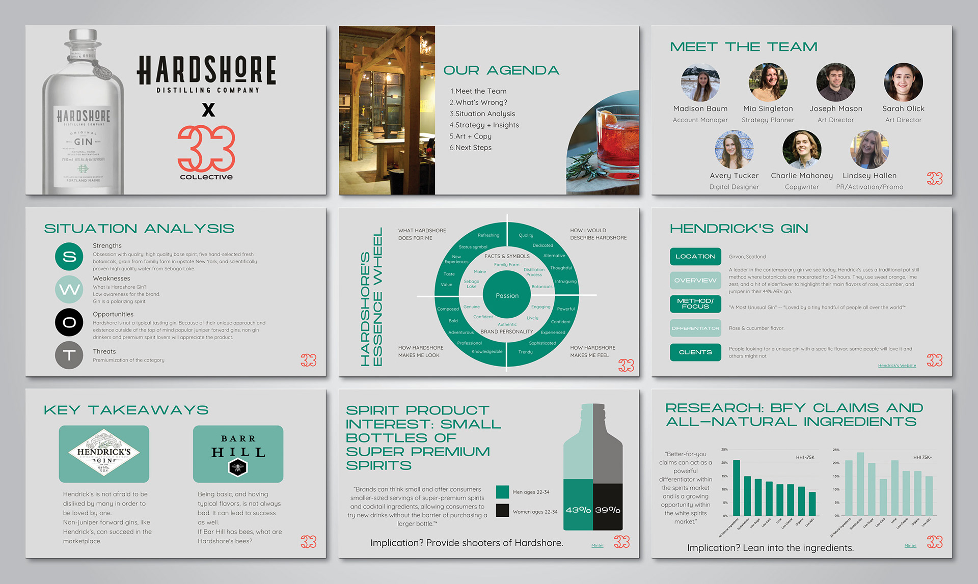 Our midterm presentation was all about strategy. We conducted a situation analysis and looked at Hardshore's competitors in order to guide us in the second half of the semester. I took the lead in designing the infographics in the selected slides below.