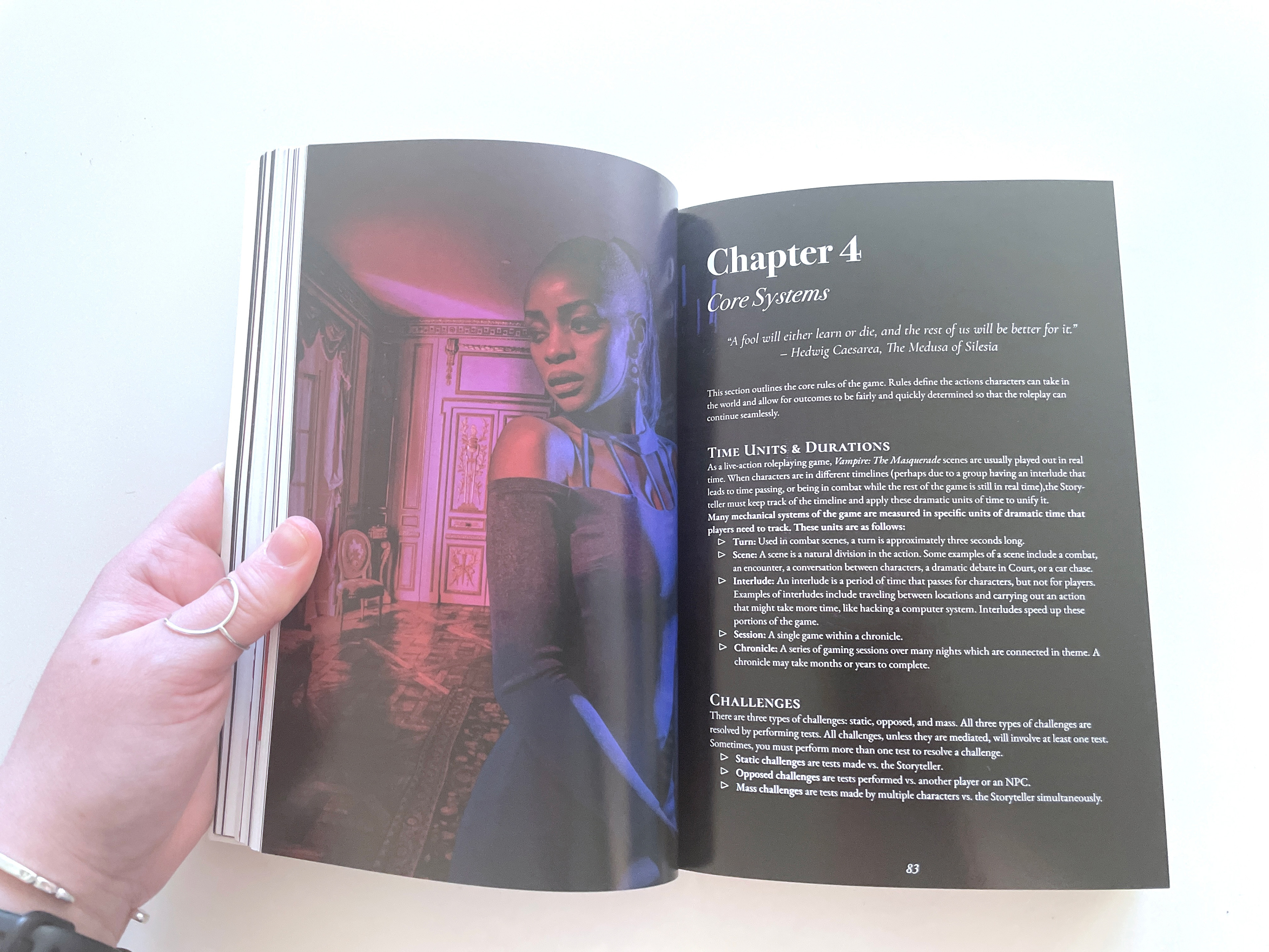 "The Quick Start Guide (QSG) is designed to give new players an easy start in V5 larp- something to glance through quickly to get the gist of what a mechanics based larp offers. They can then pick a ready-made character out of the back and jump right into game and play for a couple of sessions. It even provides a resolution mechanic for brand new players that trivializes challenges or encourages veteran players or backup storytellers to teach the new player the full process of what they are attempting to do."