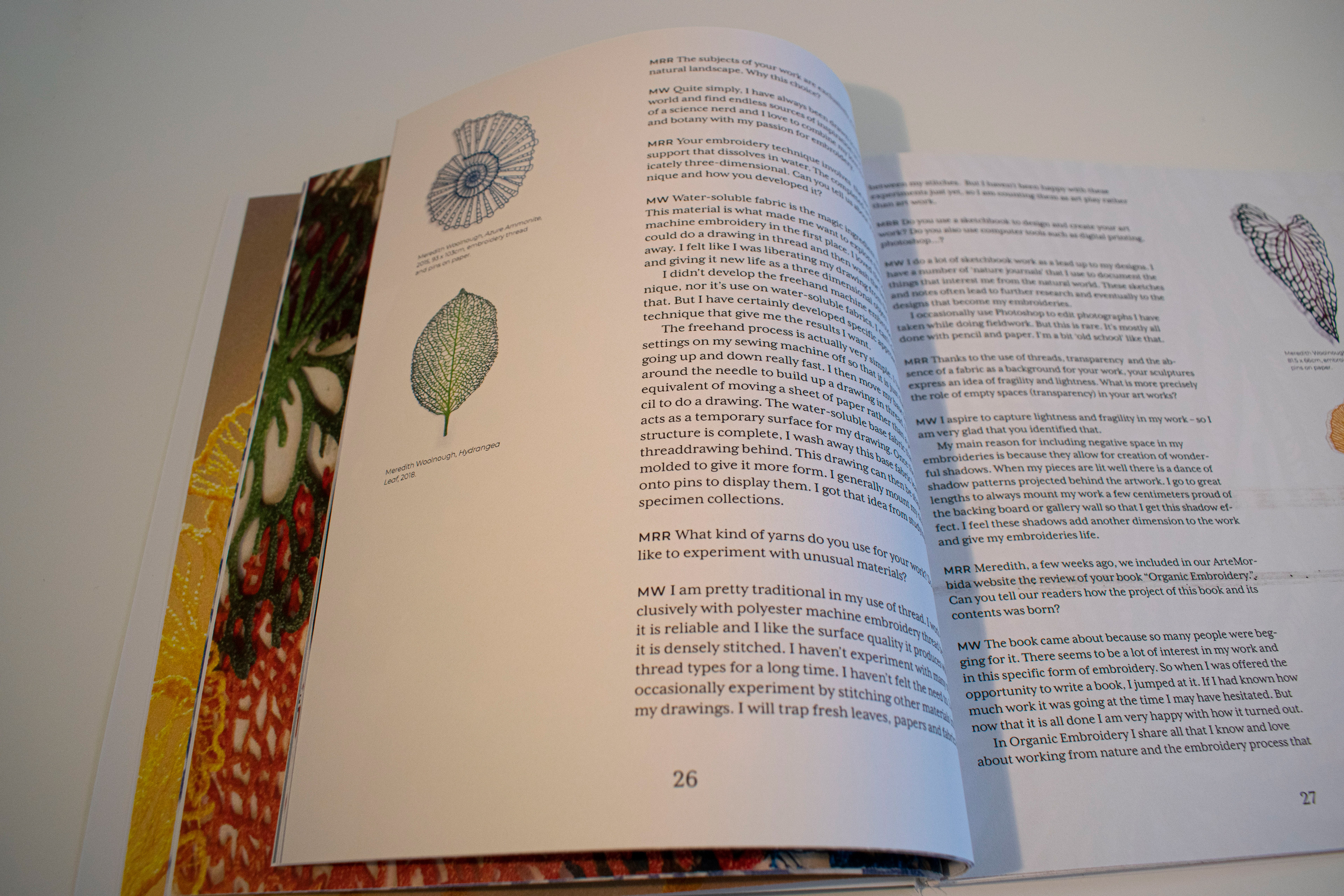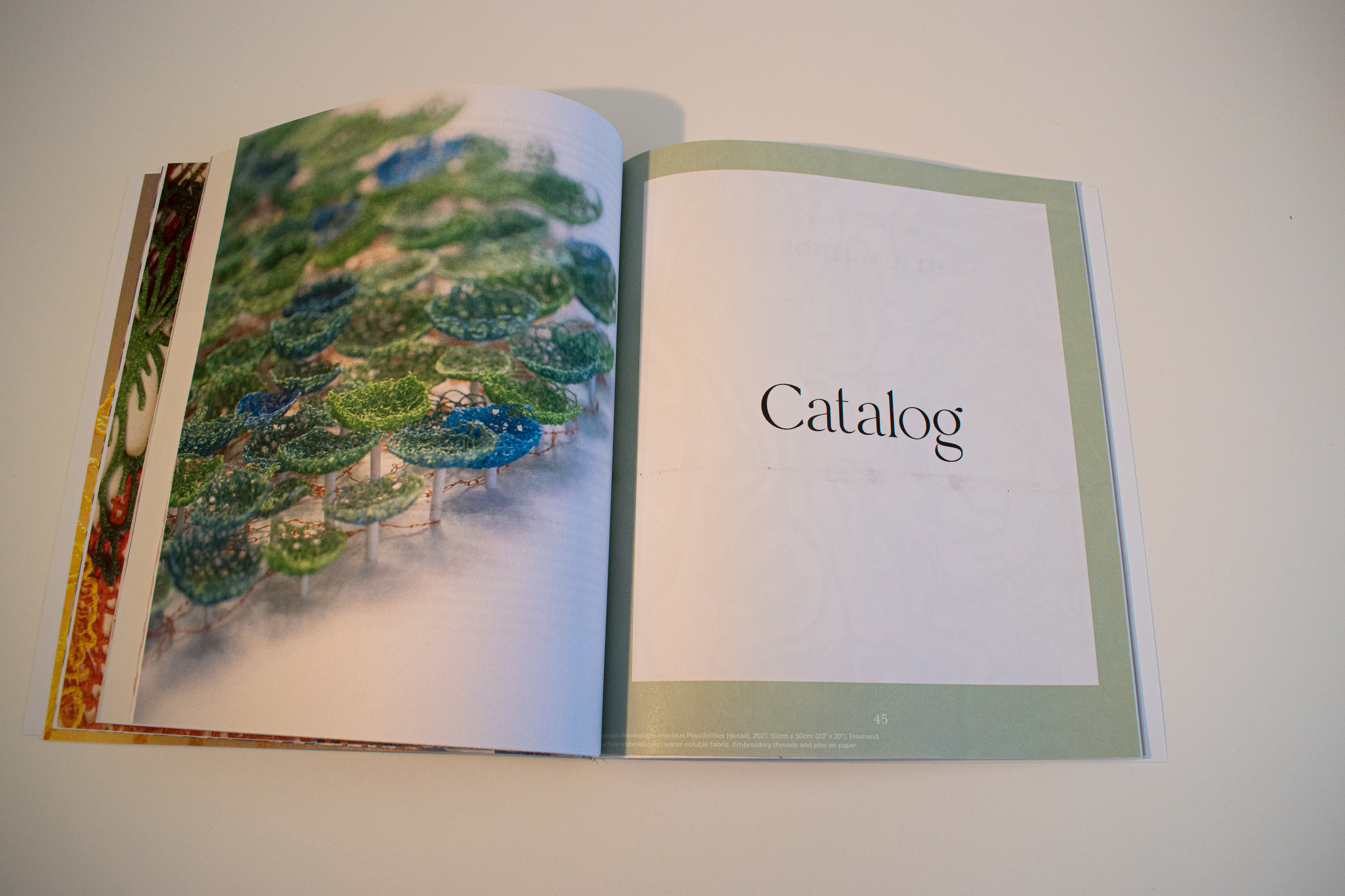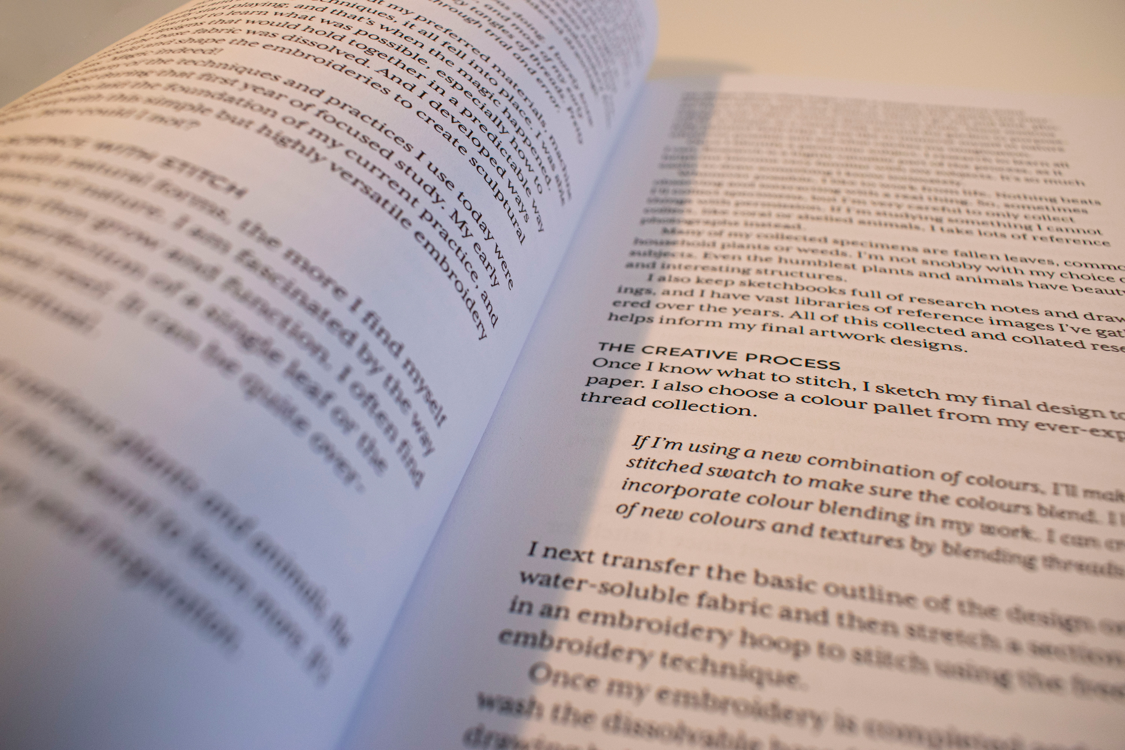 I decided to focus on Australian fiber artist, Meredith Woolnough in designing this artist monograph. The articles are sourced from TextileArtist.org, The School of Stitched Textiles, Polyfield Magazine, Embroidery Magazine, X-Ray Mag, Arte Morbida, and Woolnough's own website. I was inspired by the bright colors and fascinating textures in Woolnough's work in my choices of colors and typefaces. This 78-page publication is set in Branch, Mrs Eaves XL Serif OT, and Montserrat.