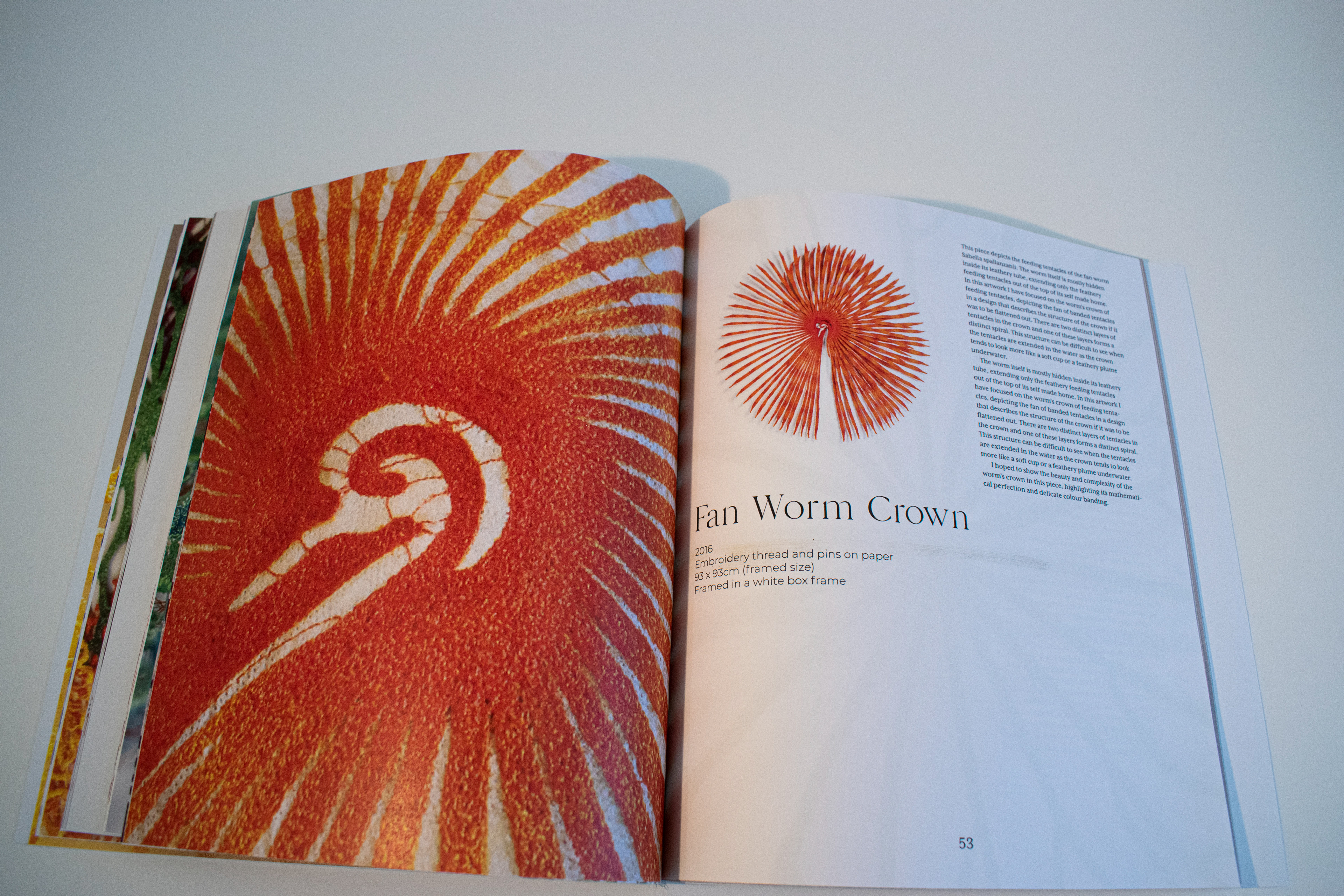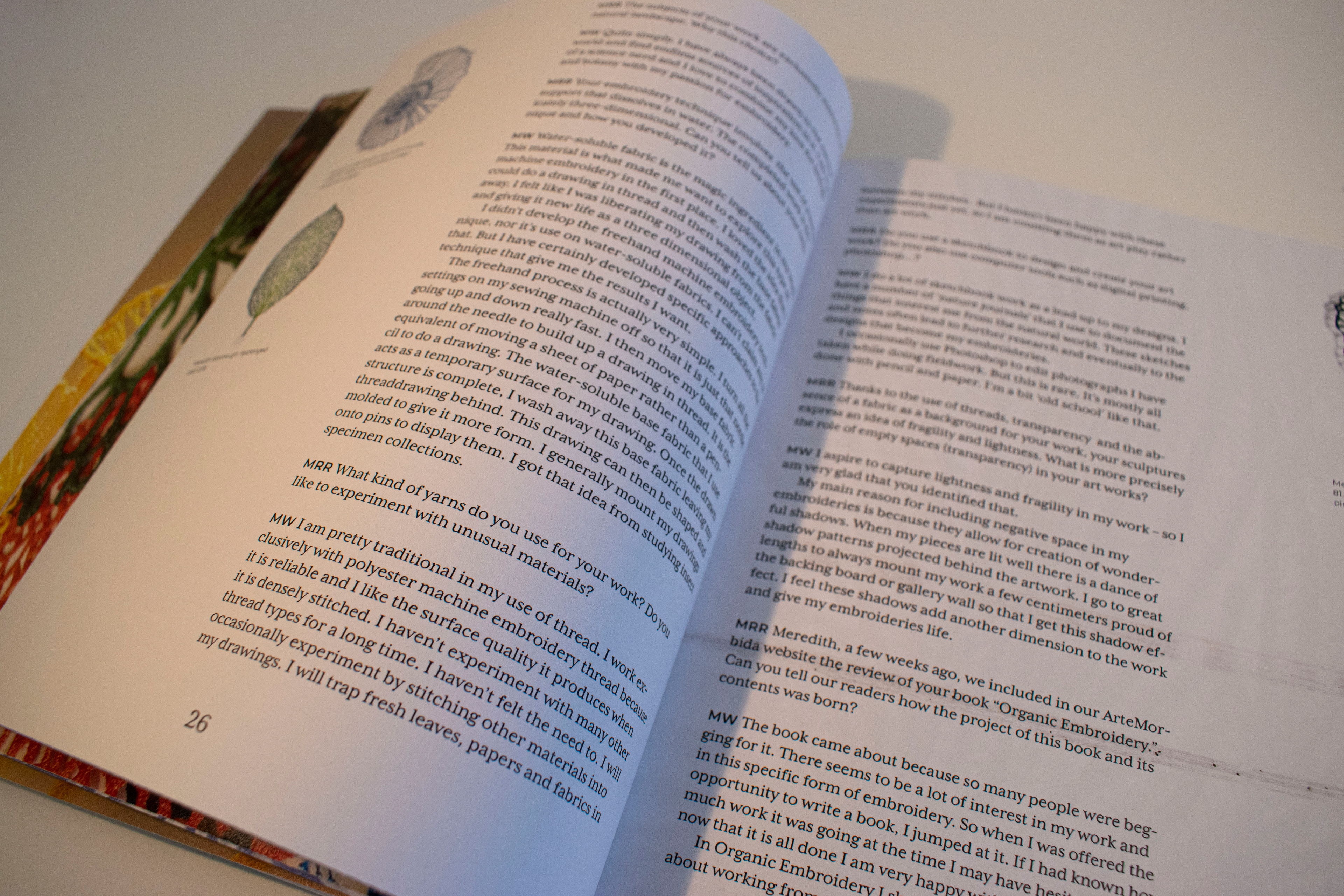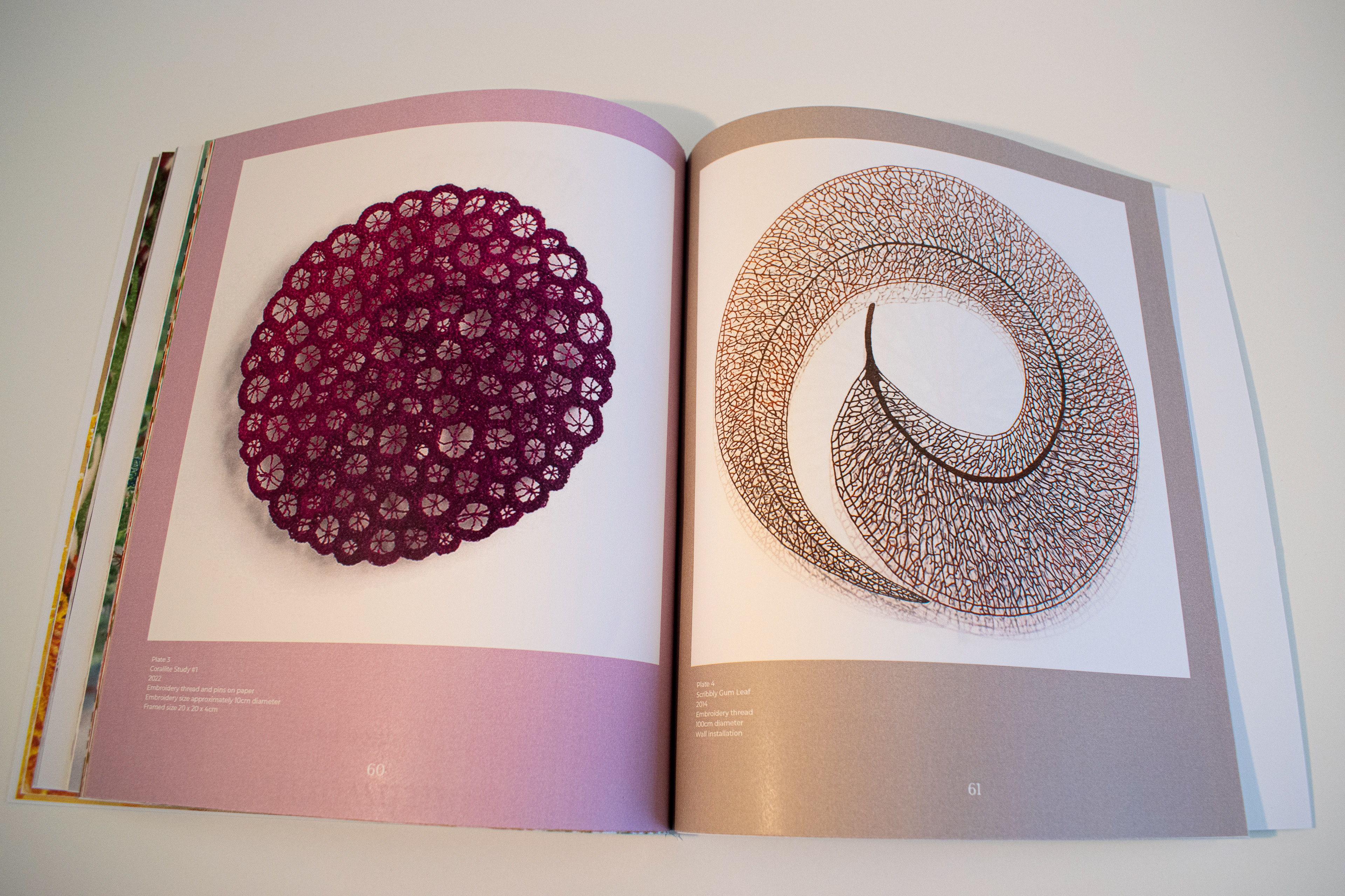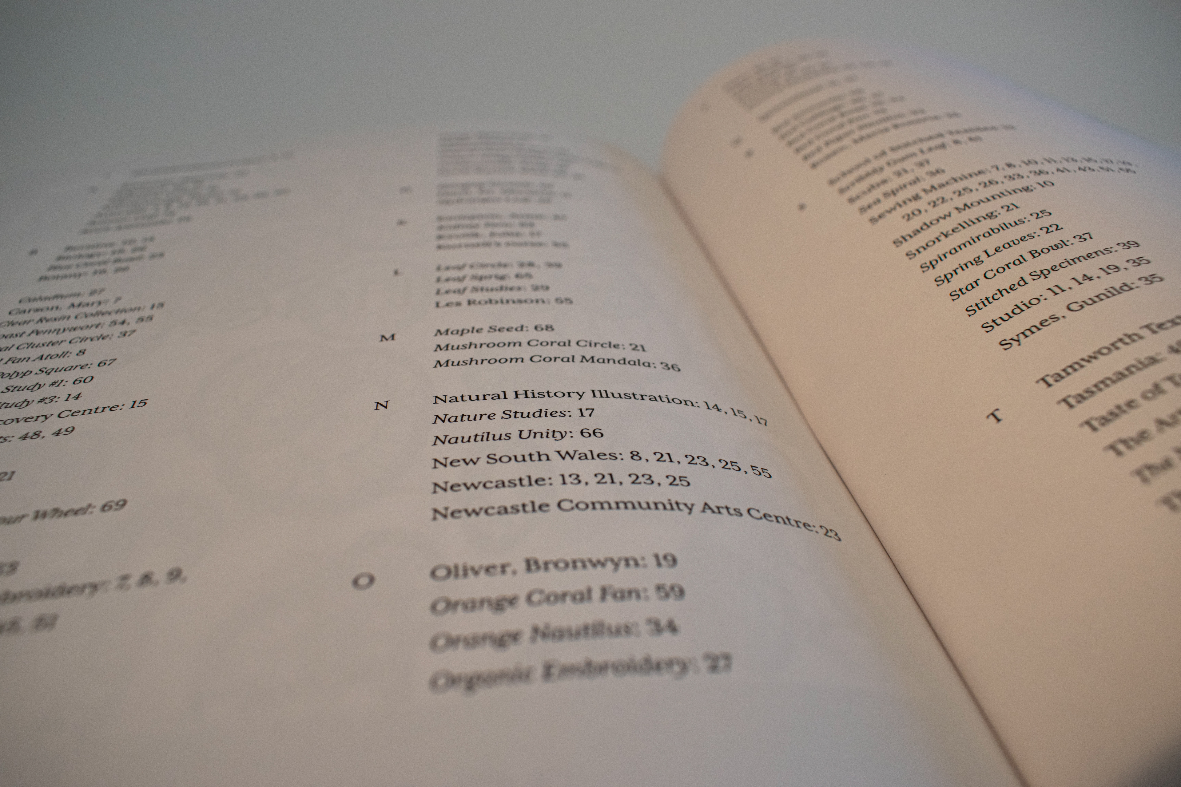 I decided to focus on Australian fiber artist, Meredith Woolnough in designing this artist monograph. The articles are sourced from TextileArtist.org, The School of Stitched Textiles, Polyfield Magazine, Embroidery Magazine, X-Ray Mag, Arte Morbida, and Woolnough's own website. I was inspired by the bright colors and fascinating textures in Woolnough's work in my choices of colors and typefaces. This 78-page publication is set in Branch, Mrs Eaves XL Serif OT, and Montserrat.