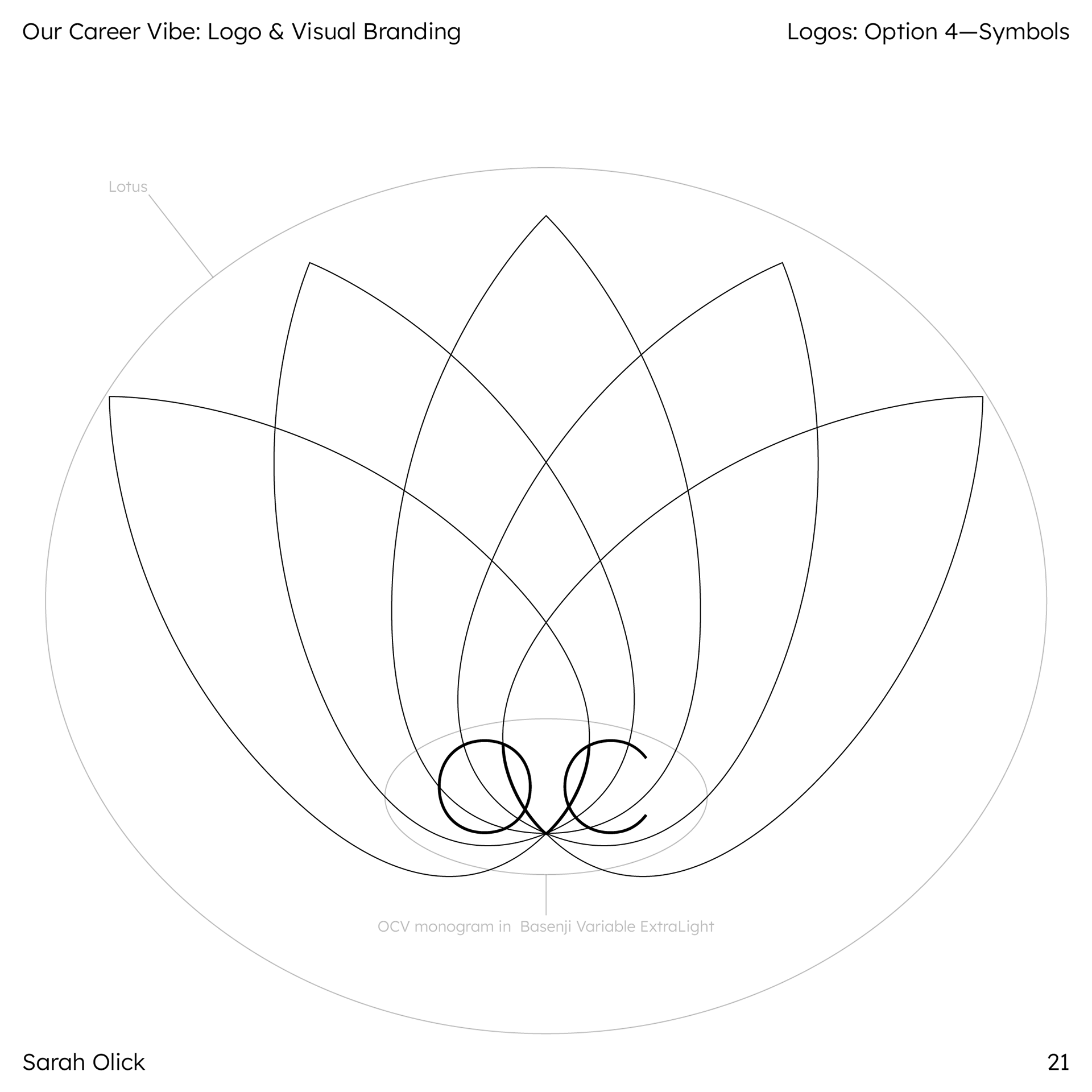 Below are the first four iterations of the logo with symbols highlighted. Option 1 combines the lotus motif with abstracted human figures to represent community. Option 2 uses the lotus motif with leaves styled as hands to represent the care found in a community. Option 3 uses a single line lotus motif showing ever-changing, continuous nature of careers. Option 4 houses an OCV monogram motif within the lotus motif.