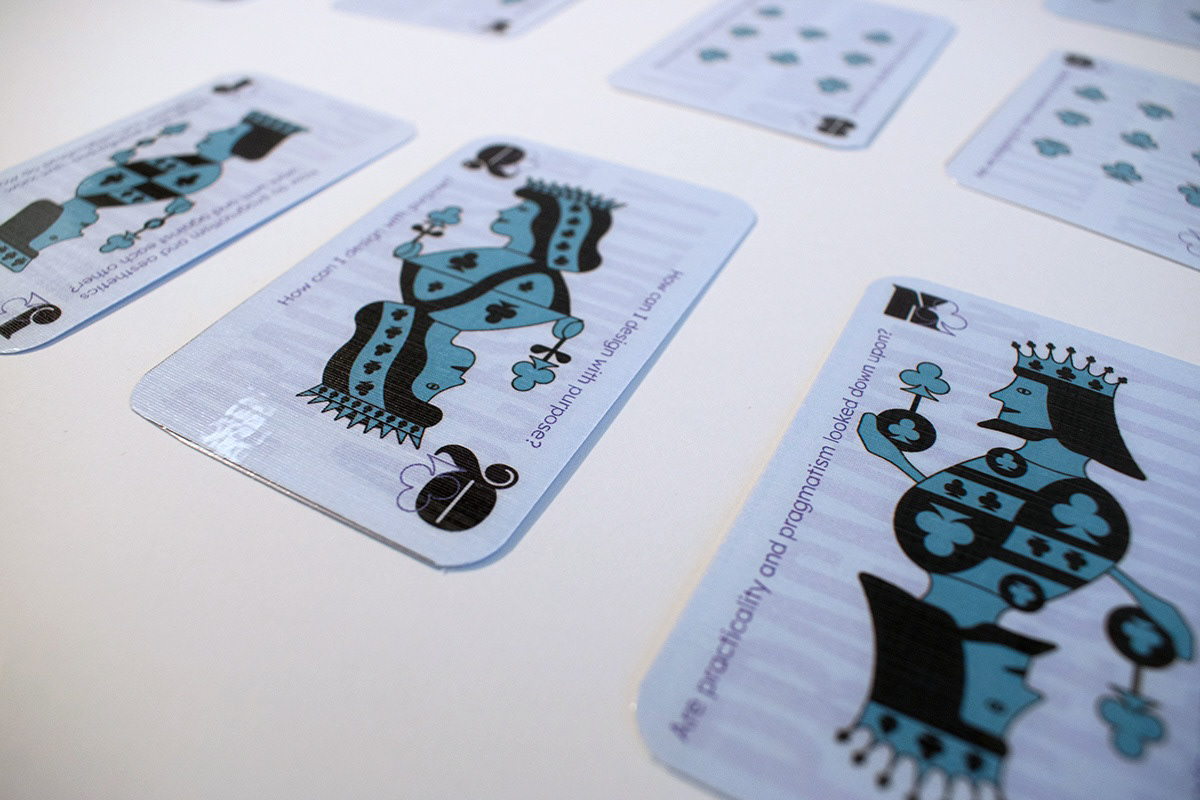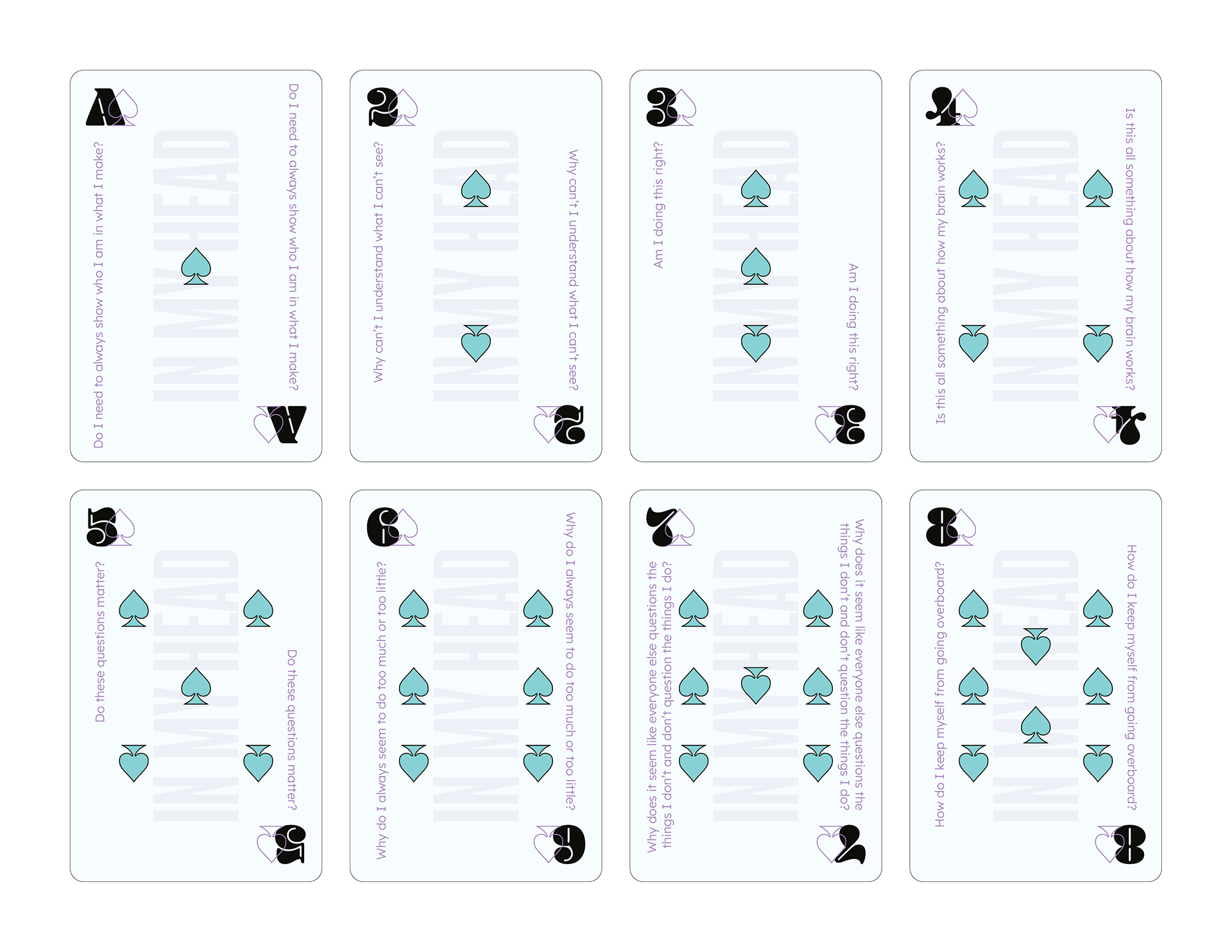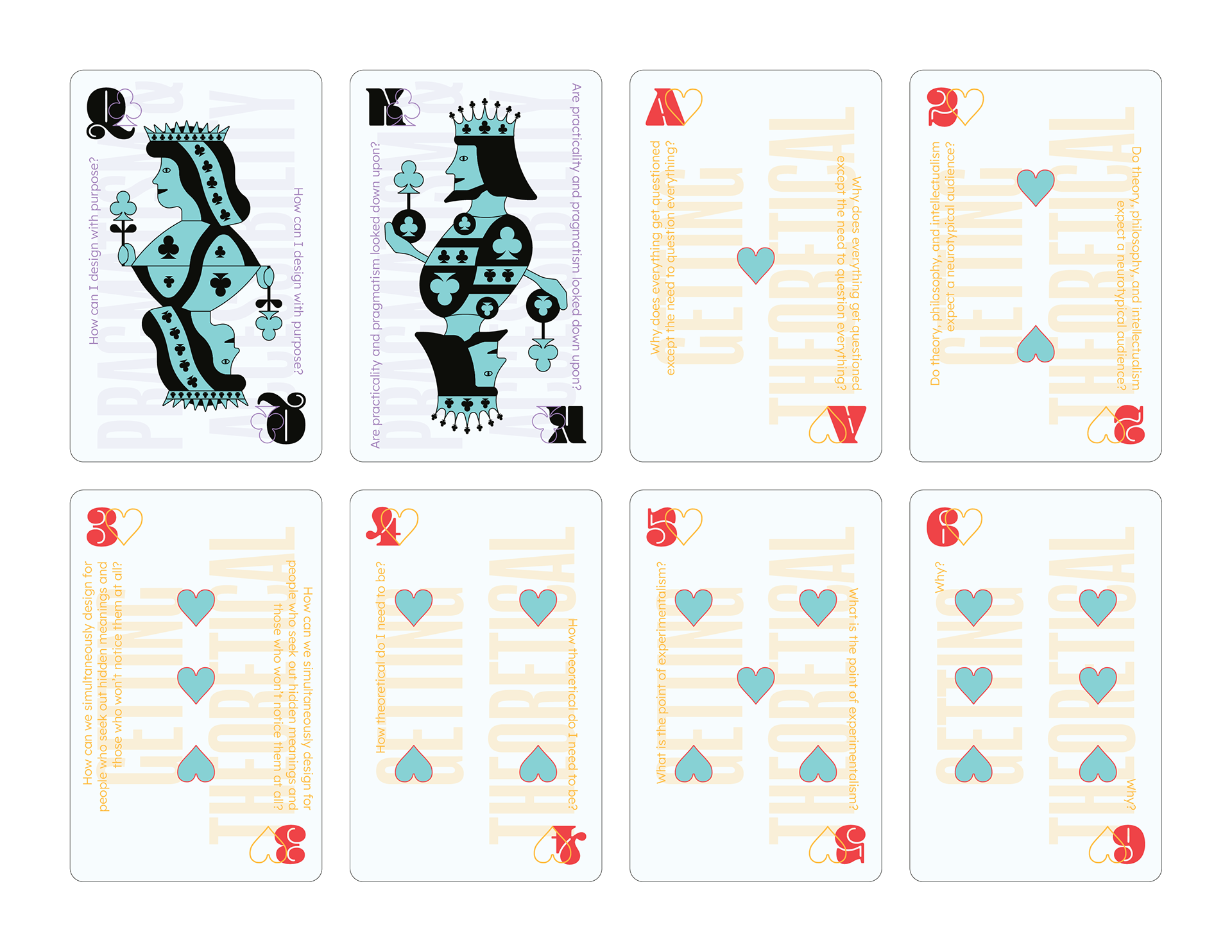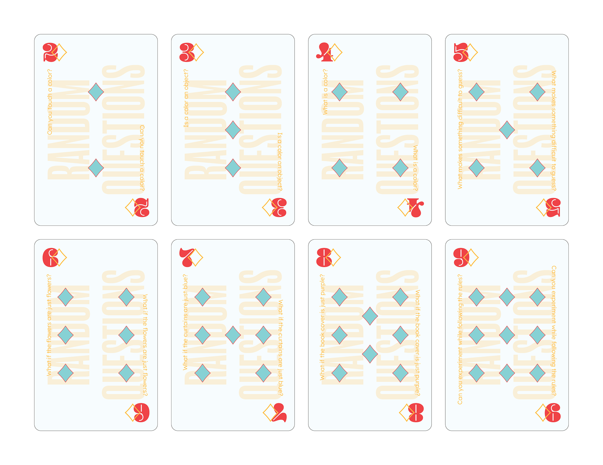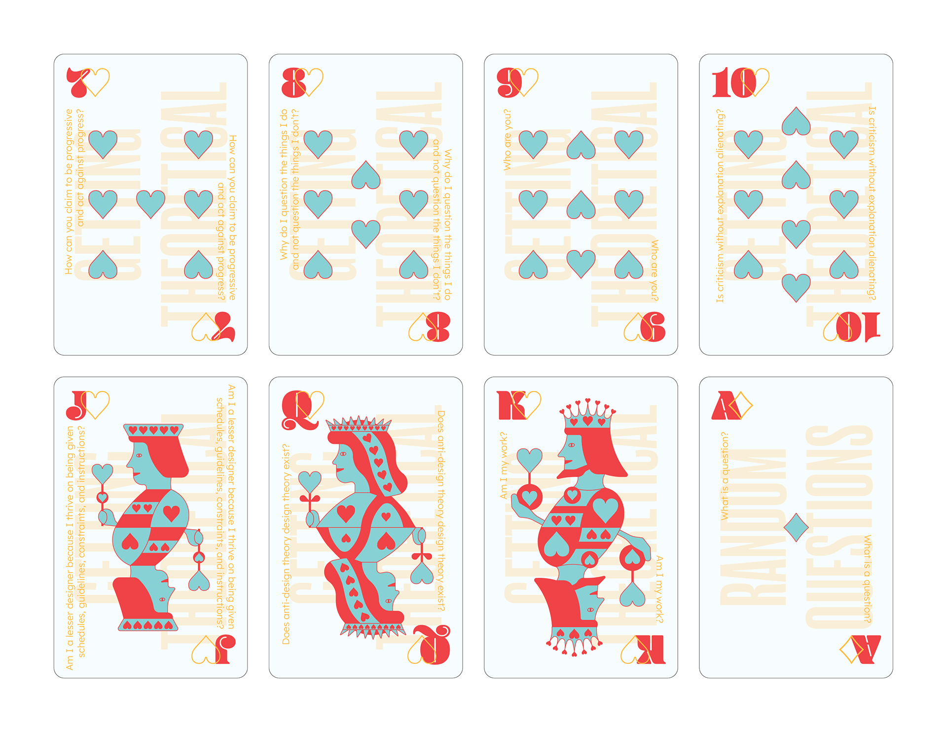 The 50 Questions assignment was seemingly simple. We were prompted to ask at least 50 questions and then present them in some sort of designed object. The idea for playing cards came simply from thinking of things that came in sets of about 50. I sorted my questions into 4 categories using the suits of the playing cards and assigned one question to each of the 52 cards. I tested out different types of paper by playing solitaire because if I was going to make playing cards, I wanted to actually be able to play card games with them. The cards are printed on my favorite paper (Southworth Linen for those who are interested) and then laminated the paper to get the look, feel, and function of playing cards. I really enjoyed the repetitive nature of working in the medium of playing cards. I love that every card is just slightly different from all of the others. My classmates also found joy in this project. As I was presenting, they started building houses of cards and sorting the cards in numerical order. This became a truly interactive project.