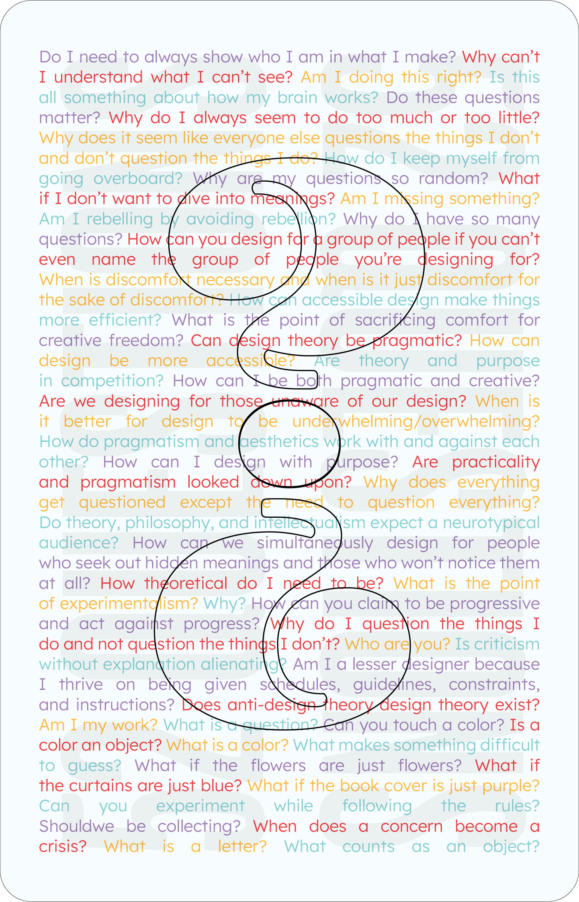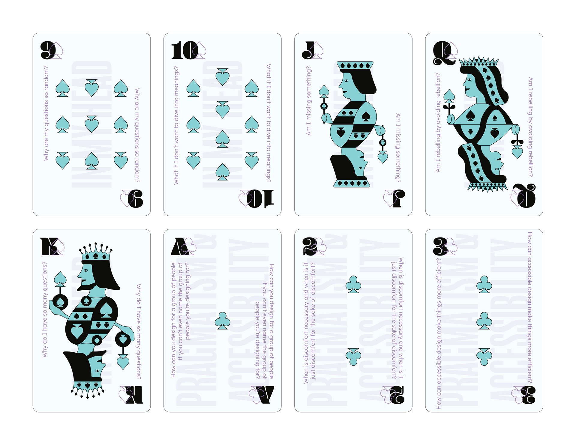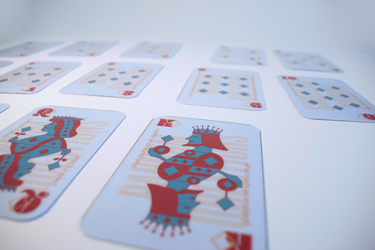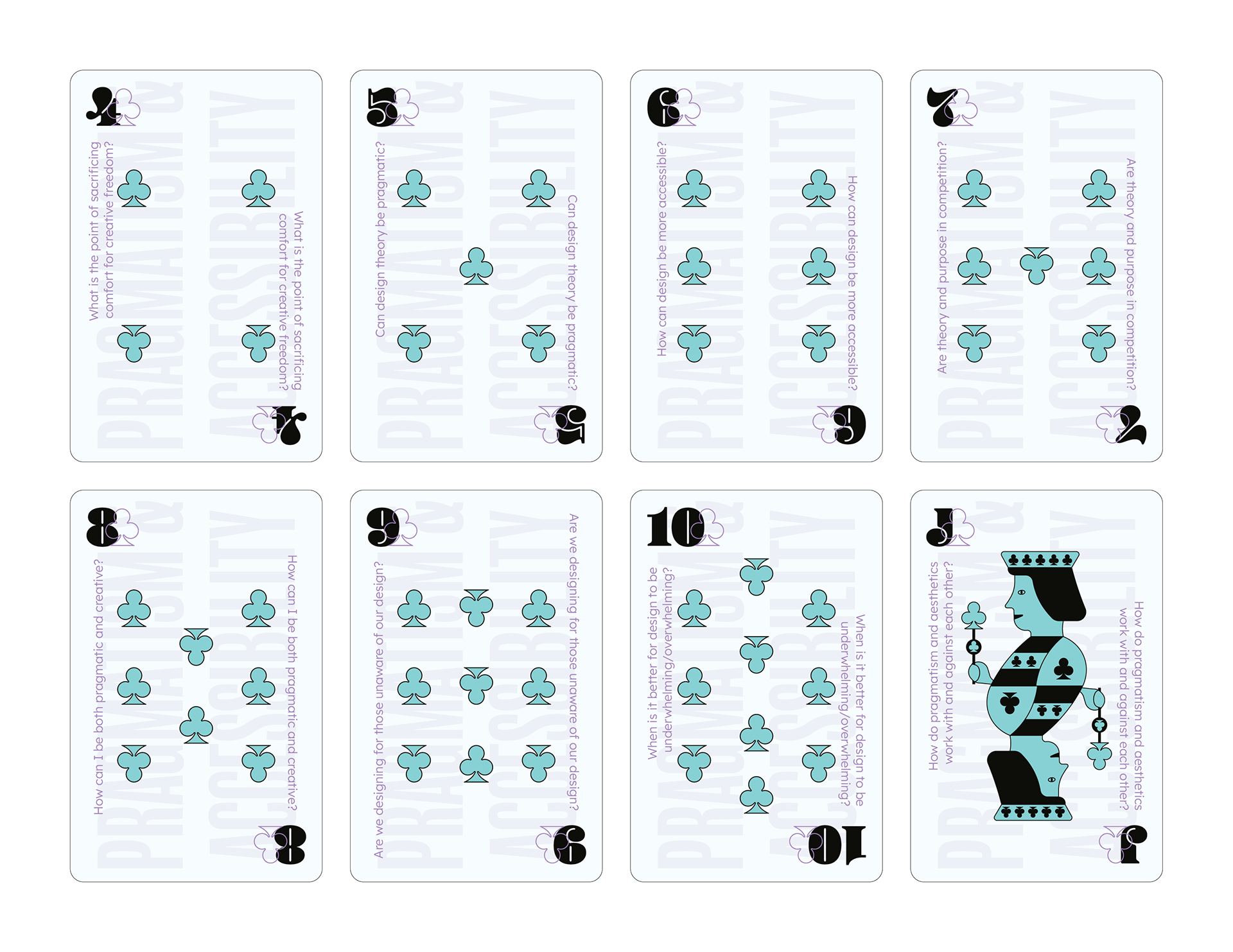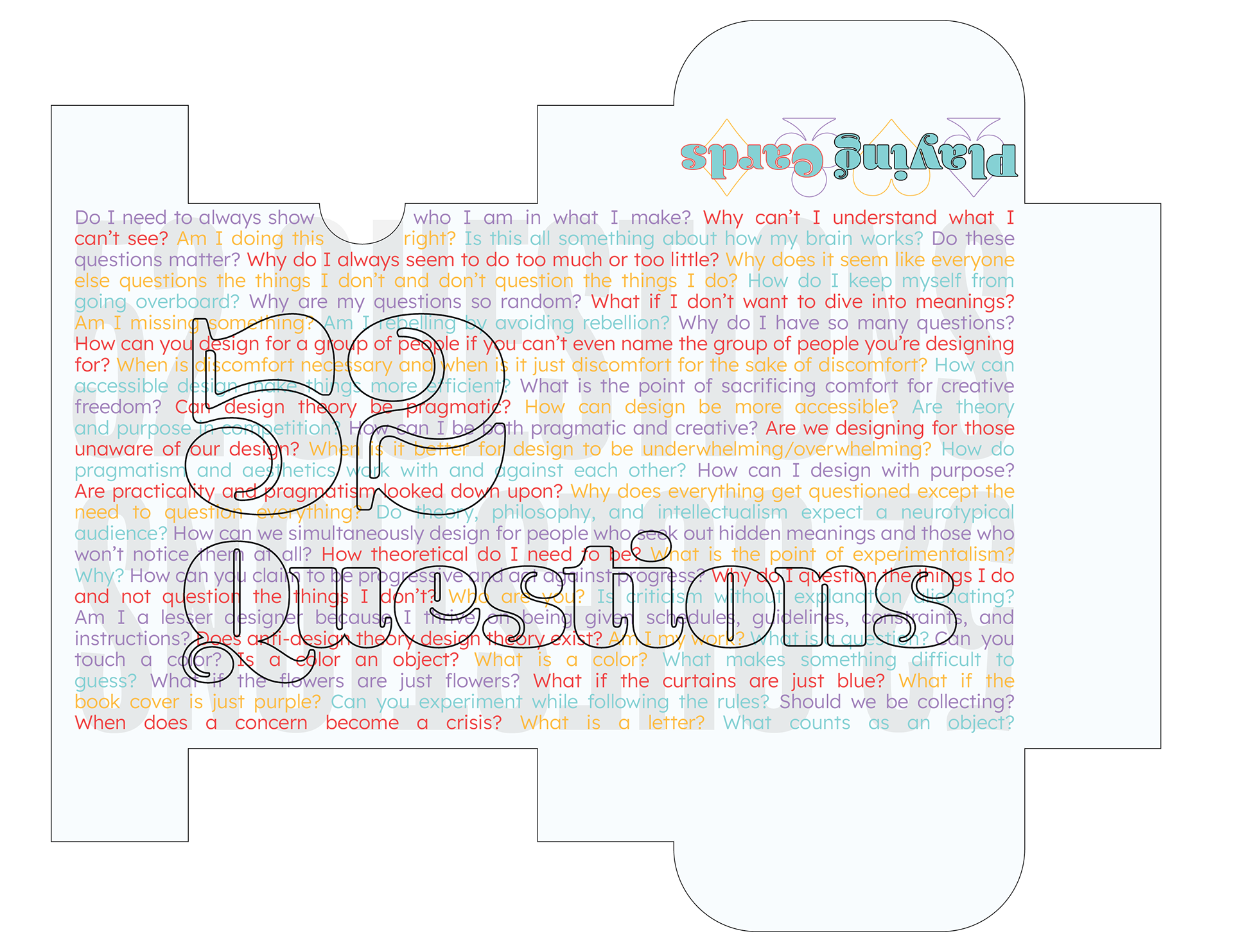 The 50 Questions assignment was seemingly simple. We were prompted to ask at least 50 questions and then present them in some sort of designed object. The idea for playing cards came simply from thinking of things that came in sets of about 50. I sorted my questions into 4 categories using the suits of the playing cards and assigned one question to each of the 52 cards. I tested out different types of paper by playing solitaire because if I was going to make playing cards, I wanted to actually be able to play card games with them. The cards are printed on my favorite paper (Southworth Linen for those who are interested) and then laminated the paper to get the look, feel, and function of playing cards. I really enjoyed the repetitive nature of working in the medium of playing cards. I love that every card is just slightly different from all of the others. My classmates also found joy in this project. As I was presenting, they started building houses of cards and sorting the cards in numerical order. This became a truly interactive project.