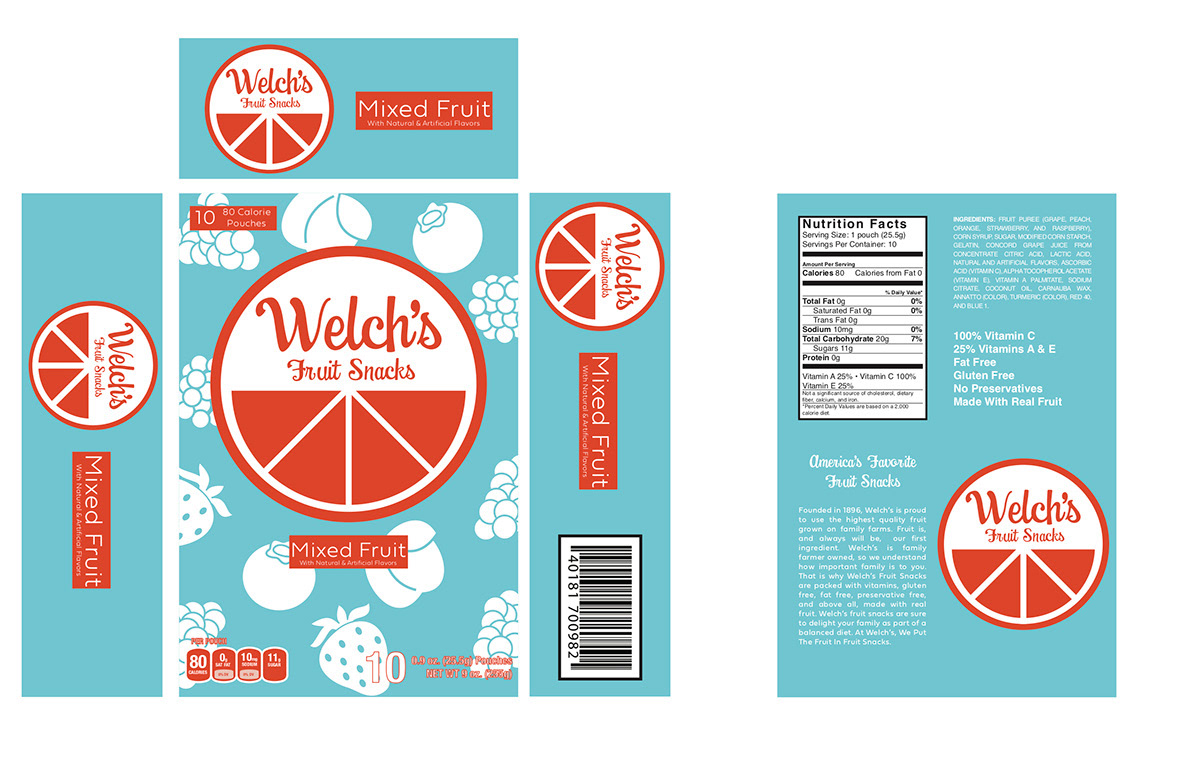 The following work is from a student assignment in which I was instructed to redesign the packaging forĀ an existing food brand and design advertisements in accordance with the new branding. I chose to modernize Welch's Fruit Snacks.